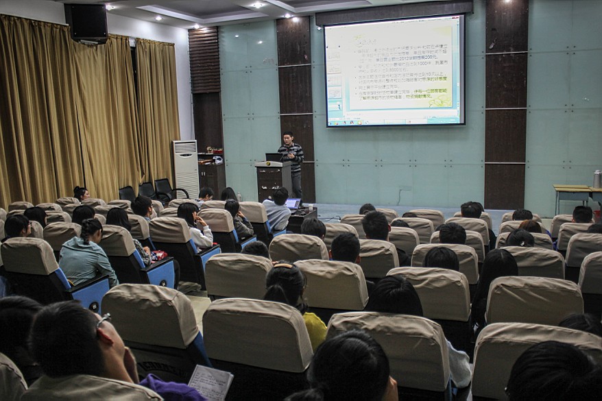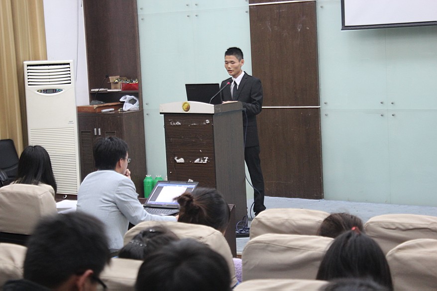 2013年11月7日傍晚,宁职院工商管理系在明德楼105会议室举行了大二学生的“班级特色项目答辩会”,工管系团委老师杨超、游华丽及市场营销专业贺剑灏老师出席并担任了本次答辩会评委工作。出席本次答辩会的还有金融、会计、物流等专业各个班级的答辩负责人。图为:答辩人正在介绍班级特色项目