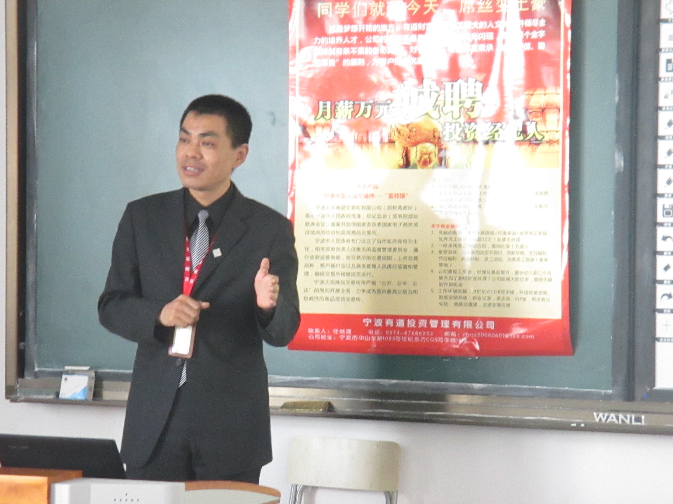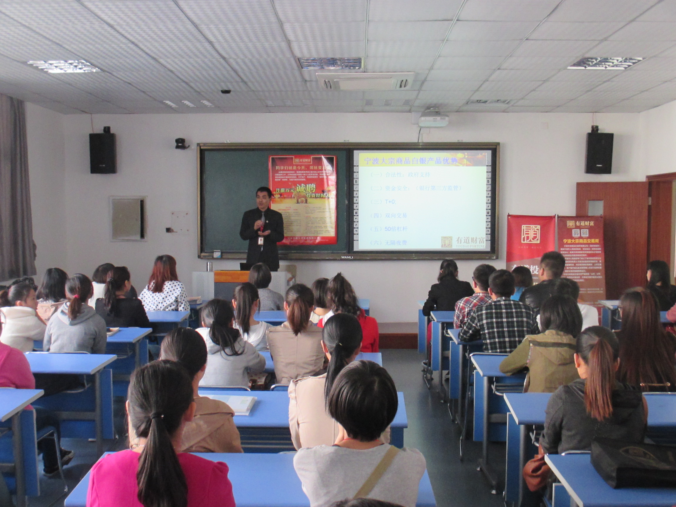 2013年11月6日中午,宁波有道投资管理有限公司宣讲会在明德楼206教室隆重举行。此次宣讲会的主讲人是宁波有道投资管理有限公司的市场总监陈震,工商管理系物流专业和会计专业的大三学生参加了本次宣讲会。“稻草放在田边,只能卖稻草的价格;稻草绑着白菜,能卖白菜的价格;稻草绑着螃蟹,就能卖螃蟹的价格。”宣讲会伊始,陈总便告诉大家,一个人只有在正确的位置才能体现出价值。此外,他还向同学们介绍了宁波有道投资有限公司的基本情况并分析了宁波大宗商品白银产品优势,尤其就合法性,资金安全,T+0,双向交易,50倍杠杆,无隔夜费等问题做了详尽的介绍,同时通过比较普通大学生毕业后在一般单位与宁波有道投资有限公司工作的情况,使学生清楚得认识到该公司在市场上的优越性。