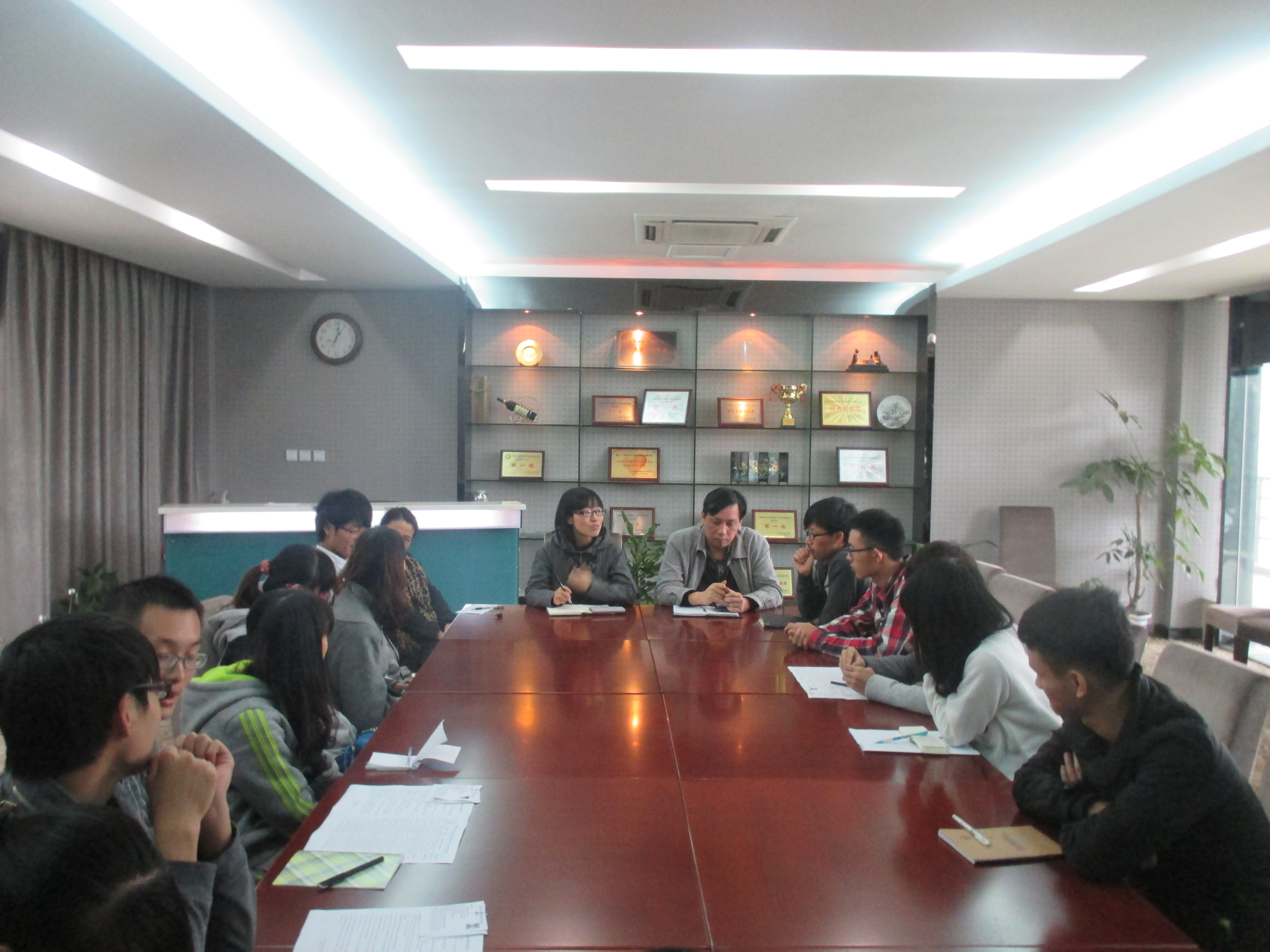 2013年11月12日中午,工商管理系期中教学检查座谈会在明德楼商务谈判中心隆重举行,出席本次会议的有工商管理系副主任叶陆艳老师,电子商务专业主任韩剑鸣老师,市场营销专业主任文晓庆老师。首先,叶老师对近期存在的问题做了一个简短的总结,并提出了切实可行的整改计划,然后亲切地向在场的学生代表们询问他们在学习工作中遇到的问题。
