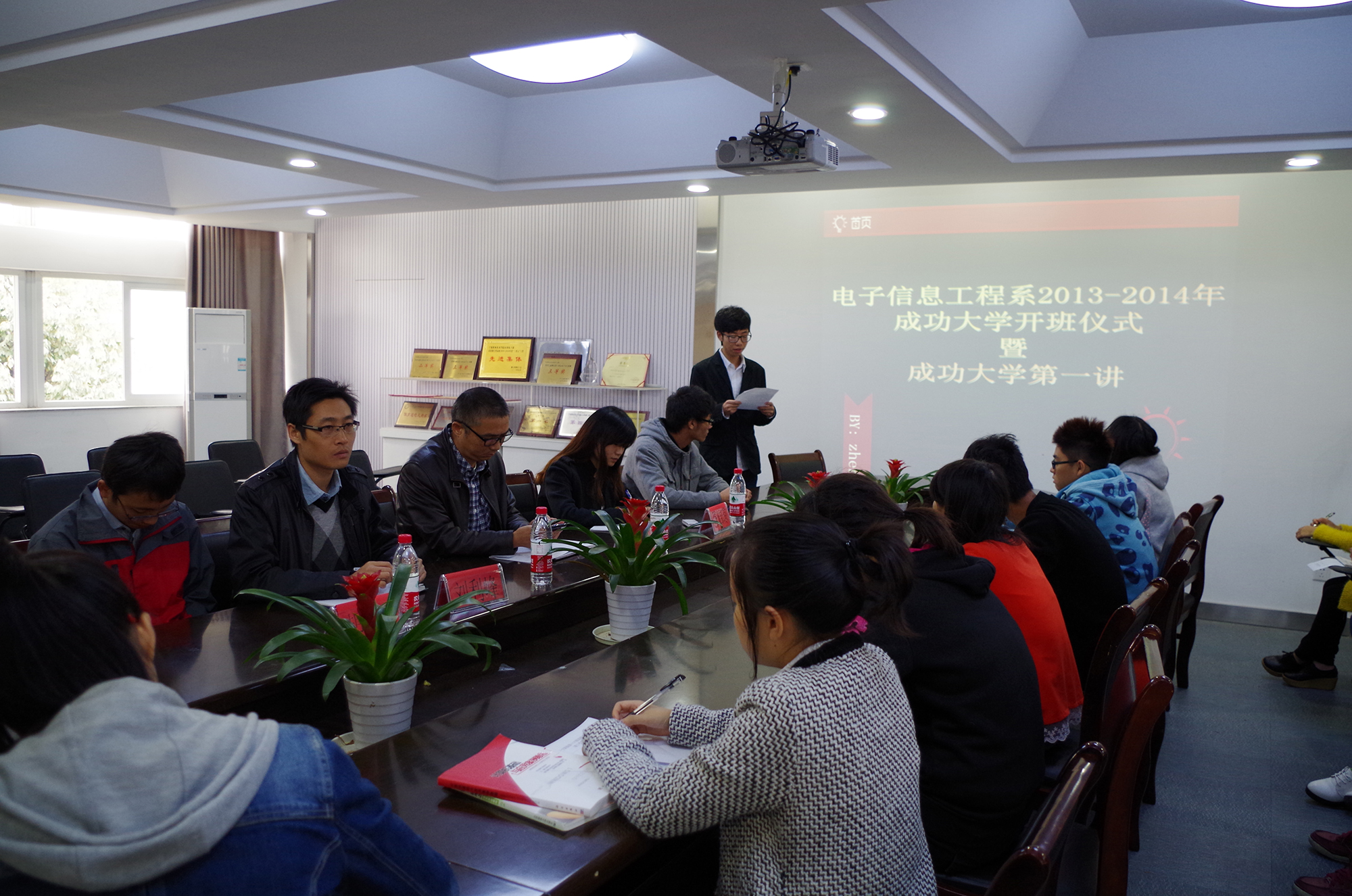 2013年11月11日中午,电子信息工程系在敬业楼党员之家举行了成功大学开班仪式。出席此次仪式的有电子信息工程系党总支书记龚友国老师,系辅导员胡国伟老师、刘利峰老师、陈洁琼老师以及来自各个班级的成功大学学员。