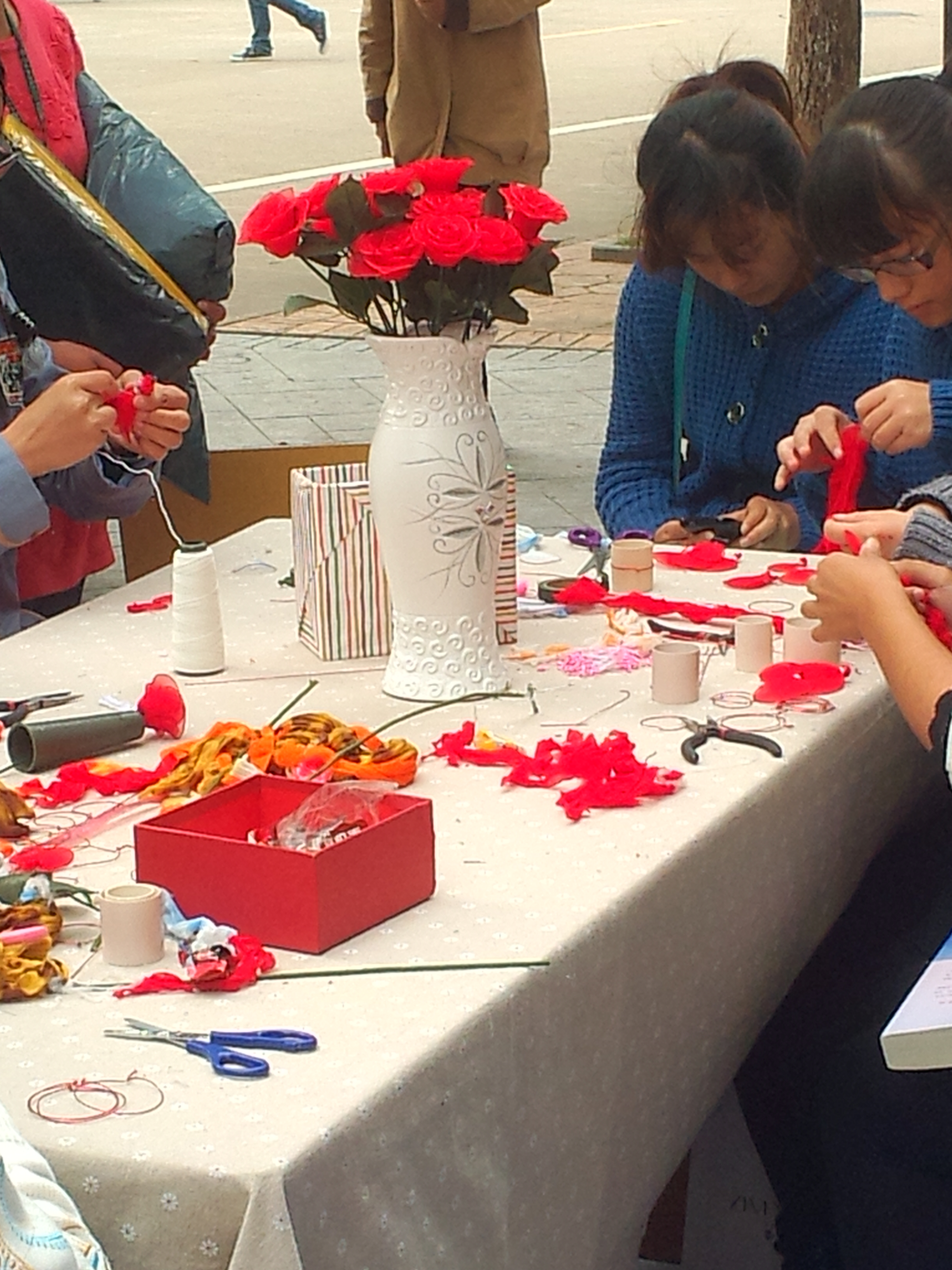 活动第一块内容为制作玫瑰花。花艺协会负责人员亲手教同学们制作黄玫瑰和红玫瑰,并与自己亲手制作的纸玫瑰拍照留念,同时自己亲手制作的纸花可以选择卖出。当日也有已经制作好的纸玫瑰可供同学们购买。活动结束后,同学们的作品还被评选出了“最佳创意奖”和“最美玫瑰奖”,获奖者得到花艺协会精美的奖品。