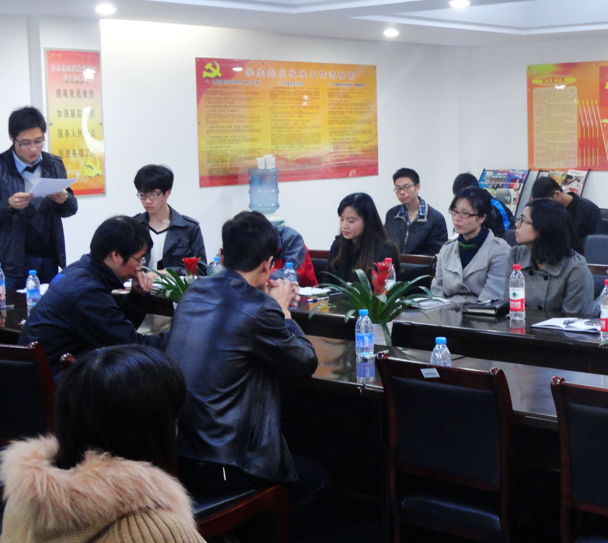2013年11月14日下午,电子信息工程系电子党支部在敬业楼党员之家举行支部大会。会议的主要议题是讨论本支部6名预备党员转正以及4名同学发展为预备党员的问题。出席本次会议的有电子信息工程系系主任吴志荣教授,系办公室主任翁芸老师,电子党支部书记刘利峰,以及其他电子党支部的党员老师,大会由刘利峰主持。