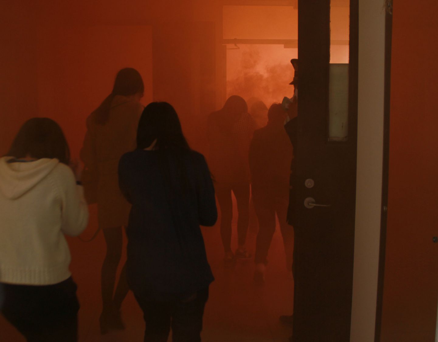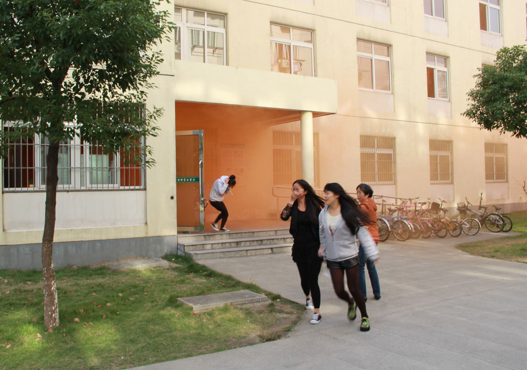 演练开始前,学校领导和寝室管理人员再次强调逃生安全,让大家千万小心,以免逃跑时过于拥挤而摔倒。十分钟后,一切准备就绪,警务人员分别在各个楼层投放了烟雾弹,以达到接近火灾现场的真实效果。顿时宿舍楼充满了黄褐色气体,随着火灾警报声响起,所有学生意识到“火灾”的发生,立即进行紧急疏散,将湿毛巾捂住口鼻冲出寝室沿楼道逃生有序逃离“火灾”现场。