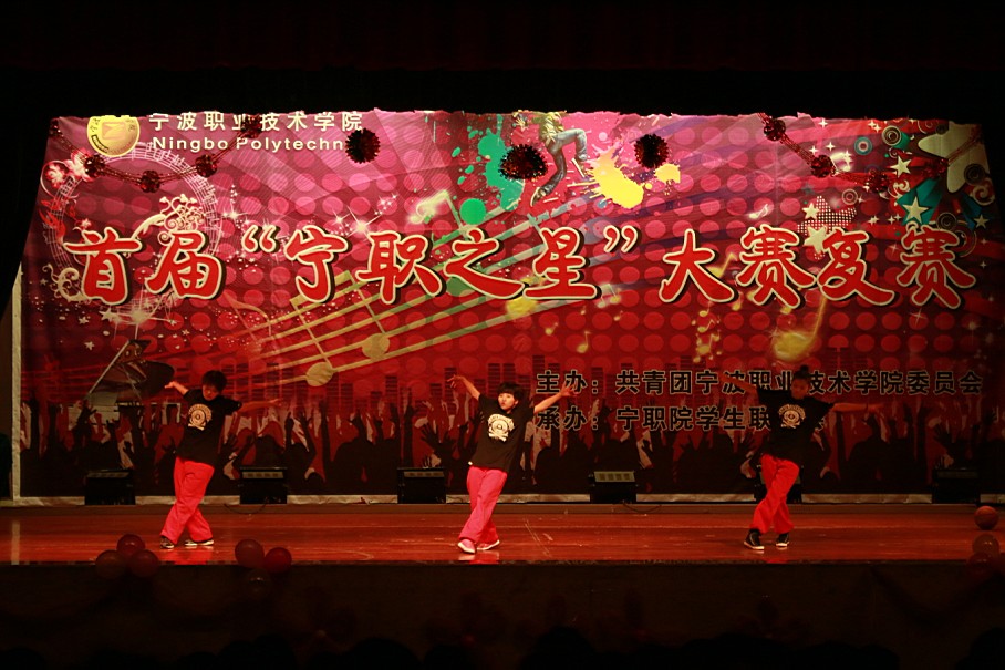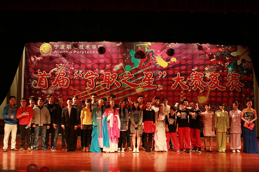为展现宁职学子的风采,在2013年11月14日晚6点,由共青团宁波职业技术学院委员会主办,宁职院学生联合会承办的首届“宁职之星”大赛复赛,在李惠利大剧院隆重举行。担任本次大赛评委的有校团委书记励宁、校团委副书记赖敏雅、应用化工系陈茜茜老师、校园十佳歌手金光宁同学。特邀嘉宾评委有北仑广播电台著名主持人启航、北仑区文化馆副馆长吴佳、北仑广播电台节目主持人韩雪。
