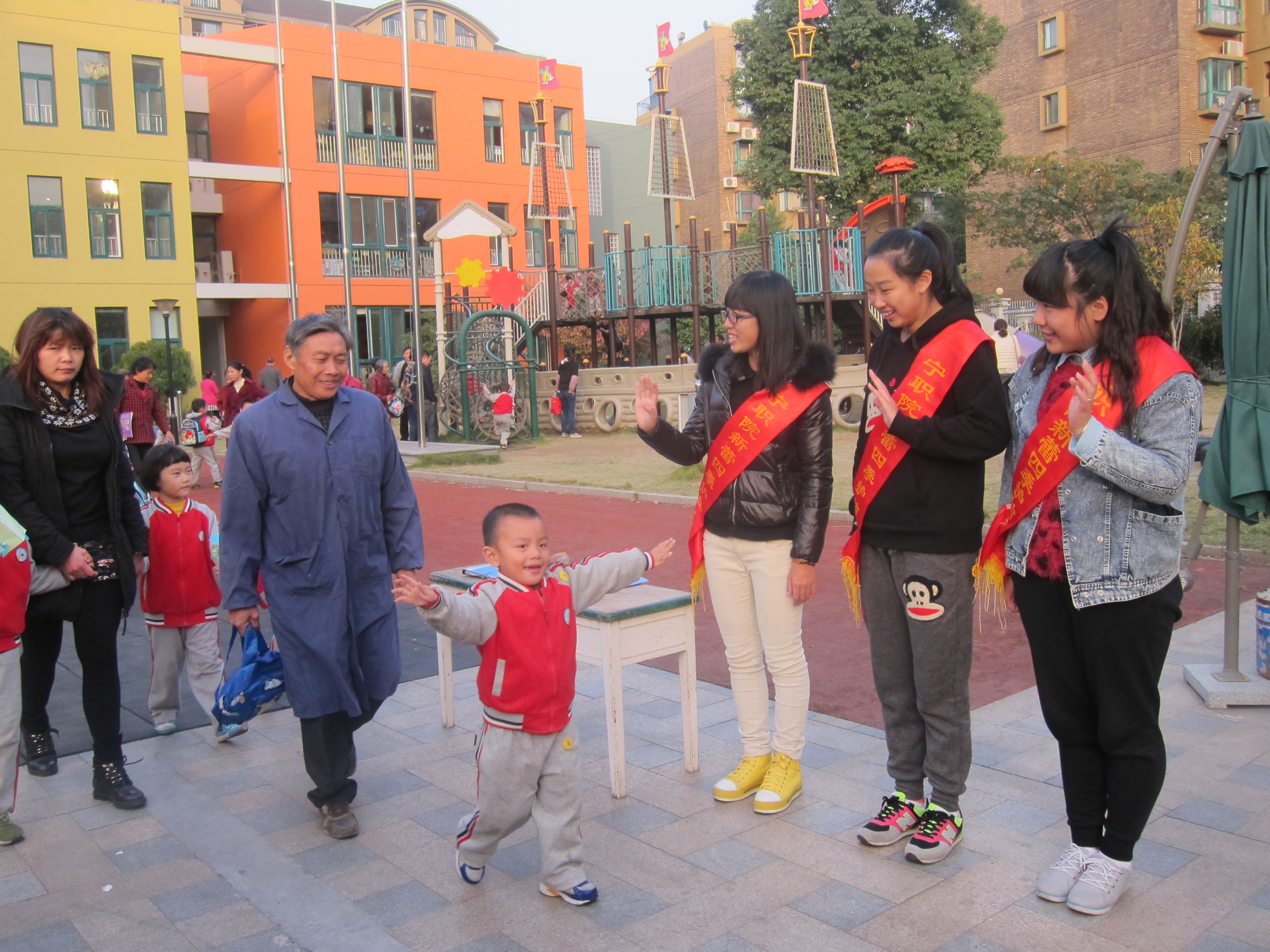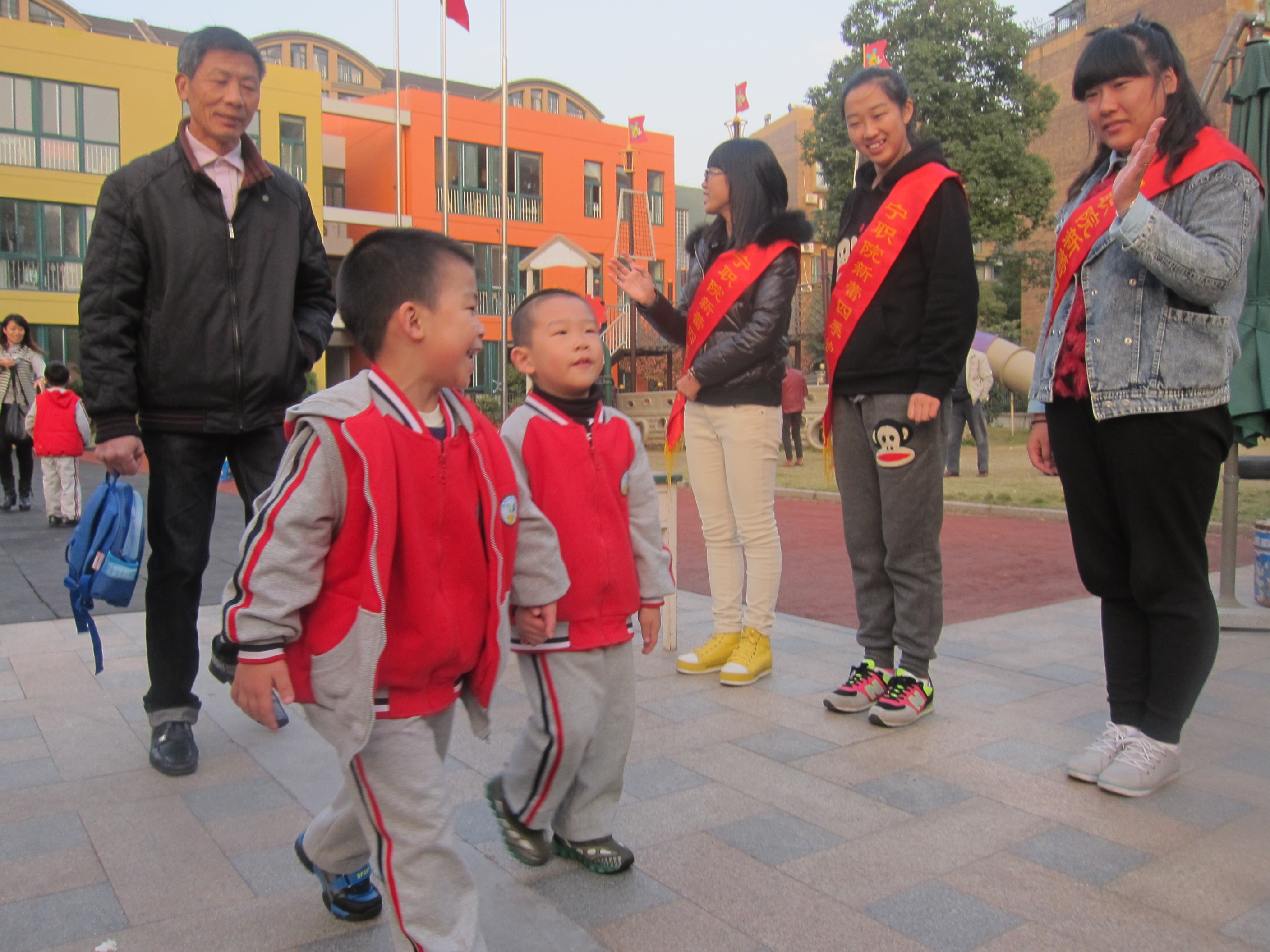在负责人张梦益同学的带领下,志愿者们来到了位于北仑区岷山路28号的新蕾四季幼儿园。到了下午16:00时,当新蕾保安打开大门之时,志愿者们早已准备完毕,整齐的站在校门两侧。每当有家长带着小朋友出去的时候,志愿者们都会跟小朋友招手,说声再见。小朋友们也会用他们稚嫩的声音跟志愿者们说着再见。从小朋友的言语中,可见他们对于这些大哥哥大姐姐一点也不陌生,可见工商管理系的志愿者们亲切、和善的形象在小朋友的心里留下了根深蒂固的印象。