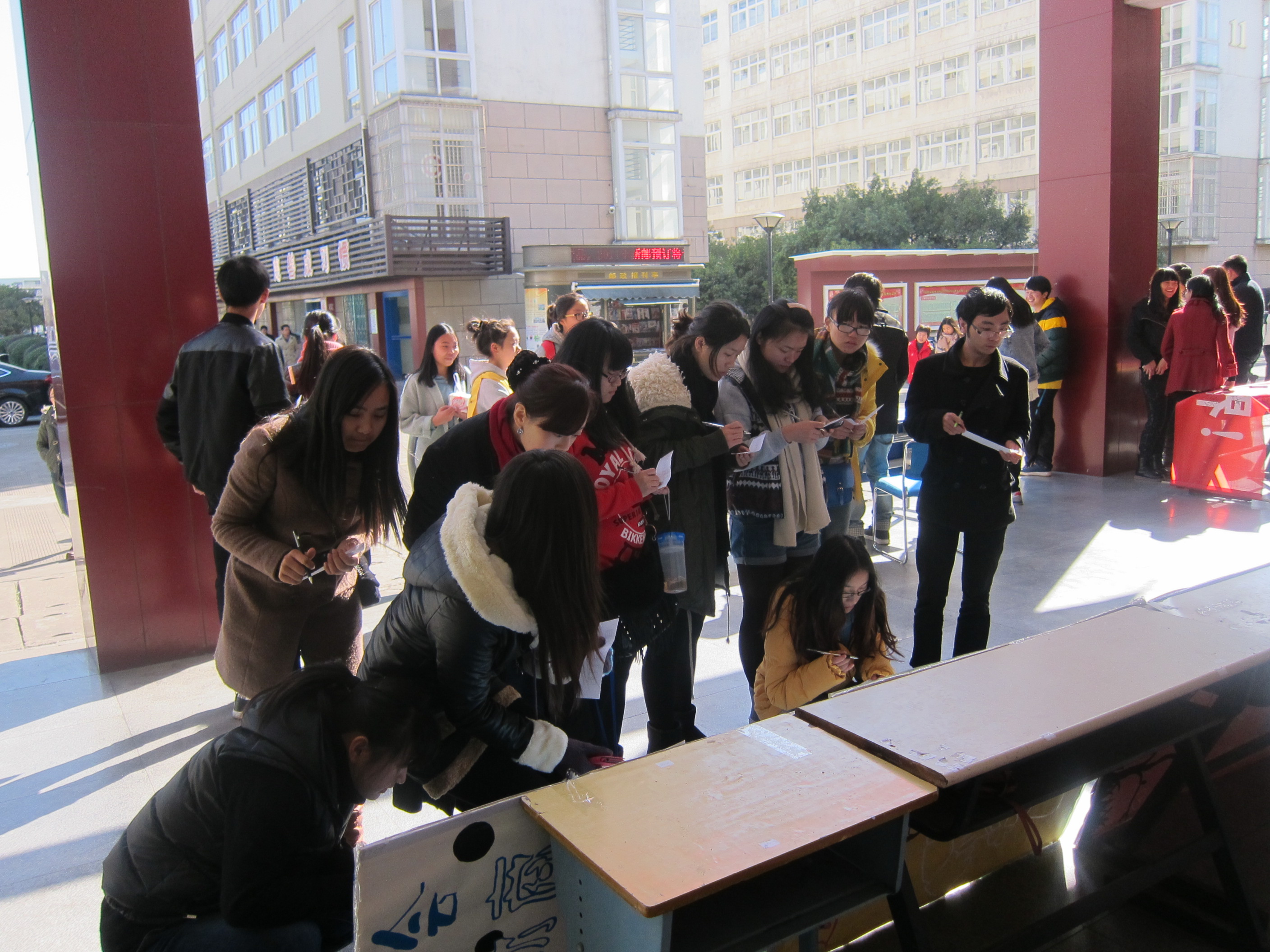 当日,信息部的干事们早早来到食堂楼下,在进行简单的场地布置后,投票活动正式拉开序幕。本次活动吸引了许多过往同学的注意,其中有不少同学都在海报前驻足,干事们上前递上投票单,开始讲解该活动内容。经过干事们的耐心讲解,同学们以及老师们在投票单上选出了自己最满意的几张照片。热闹的场面吸引了大量人群,甚至有许多同学主动去索要投票单。作品的丰富性以及作品所传递的温暖,给了老师和同学很大的震撼。时间匆匆,在活动快结束时,据悉,本次大赛的作品将在12月1日通过短信方式通知获奖选手。