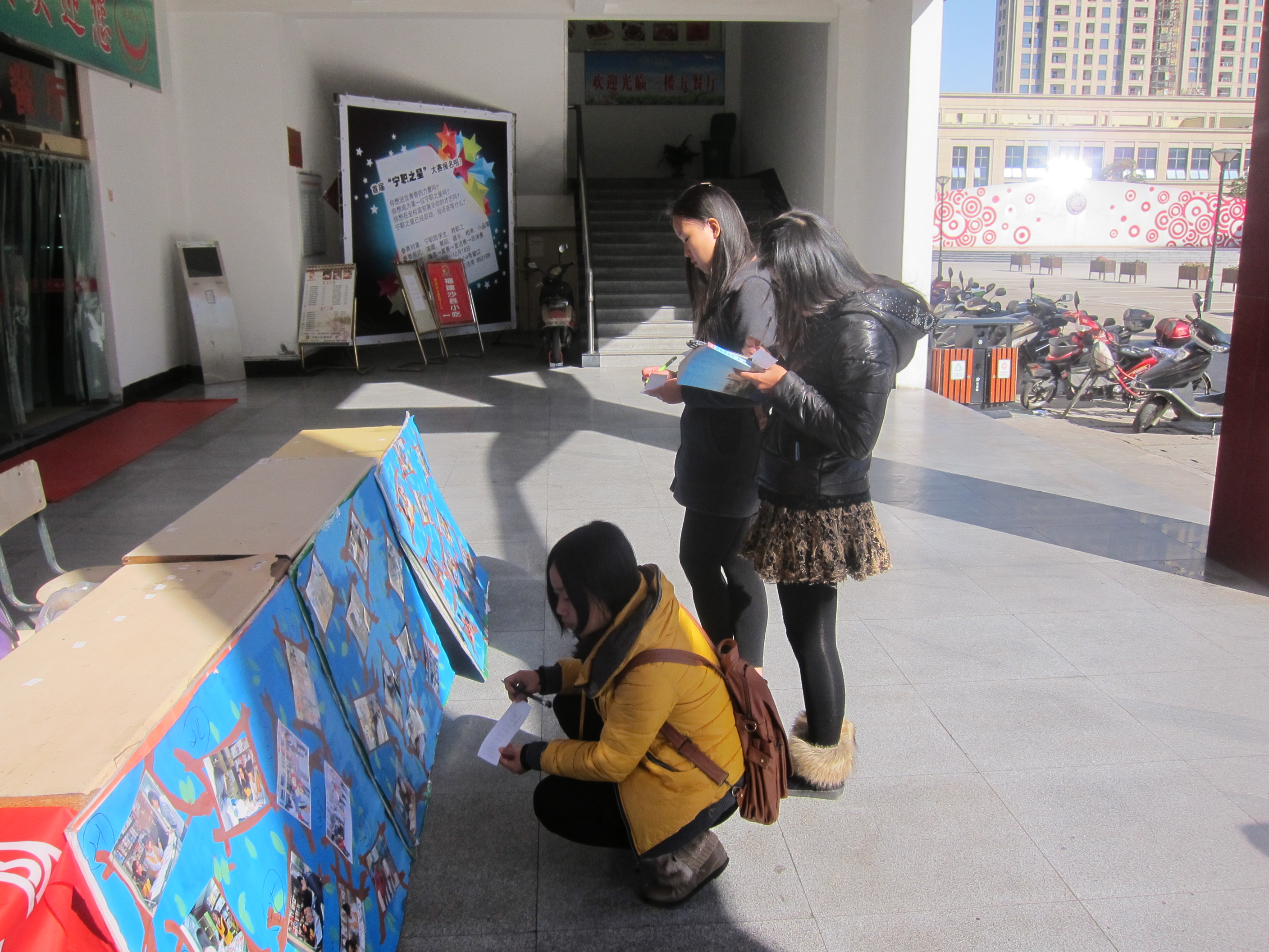 为使奉献、友爱、互助、进步的青年志愿者精神在工商学子中发扬光大。由工商管理系信息部举办的以志愿者为主题的摄影大赛于11月28日中午在宁波职业技术学院餐厅门口进行了投票活动。据悉,此次活动进行了为期7天的作品征集宣传,在海选期间共收到了100份摄影作品,最终30张作品脱颖而出,在餐厅门口展示。作品内容丰富,其中包括北仑区阳光学校志愿者、新蕾护苗志愿者、校报刊亭志愿者等。