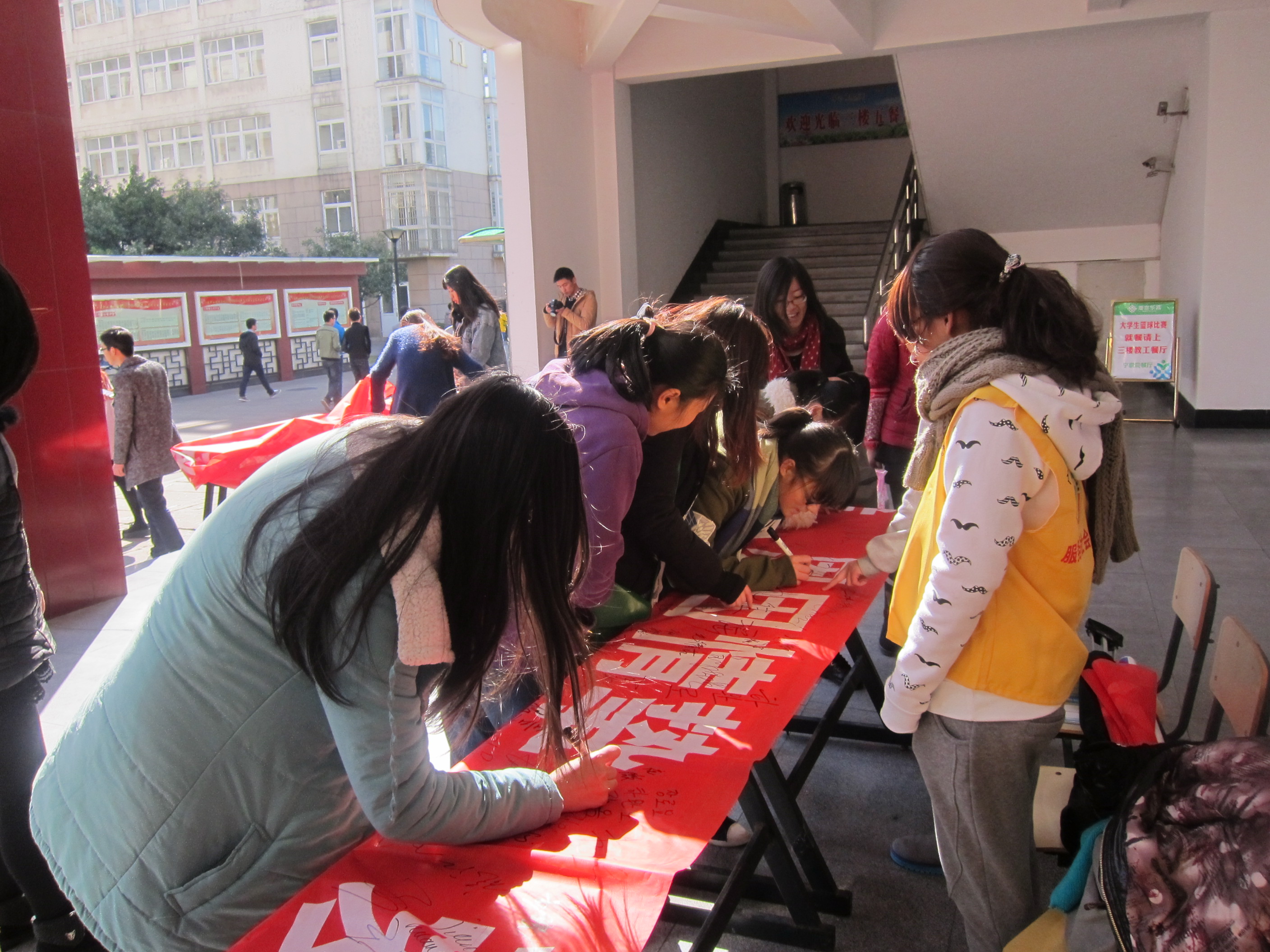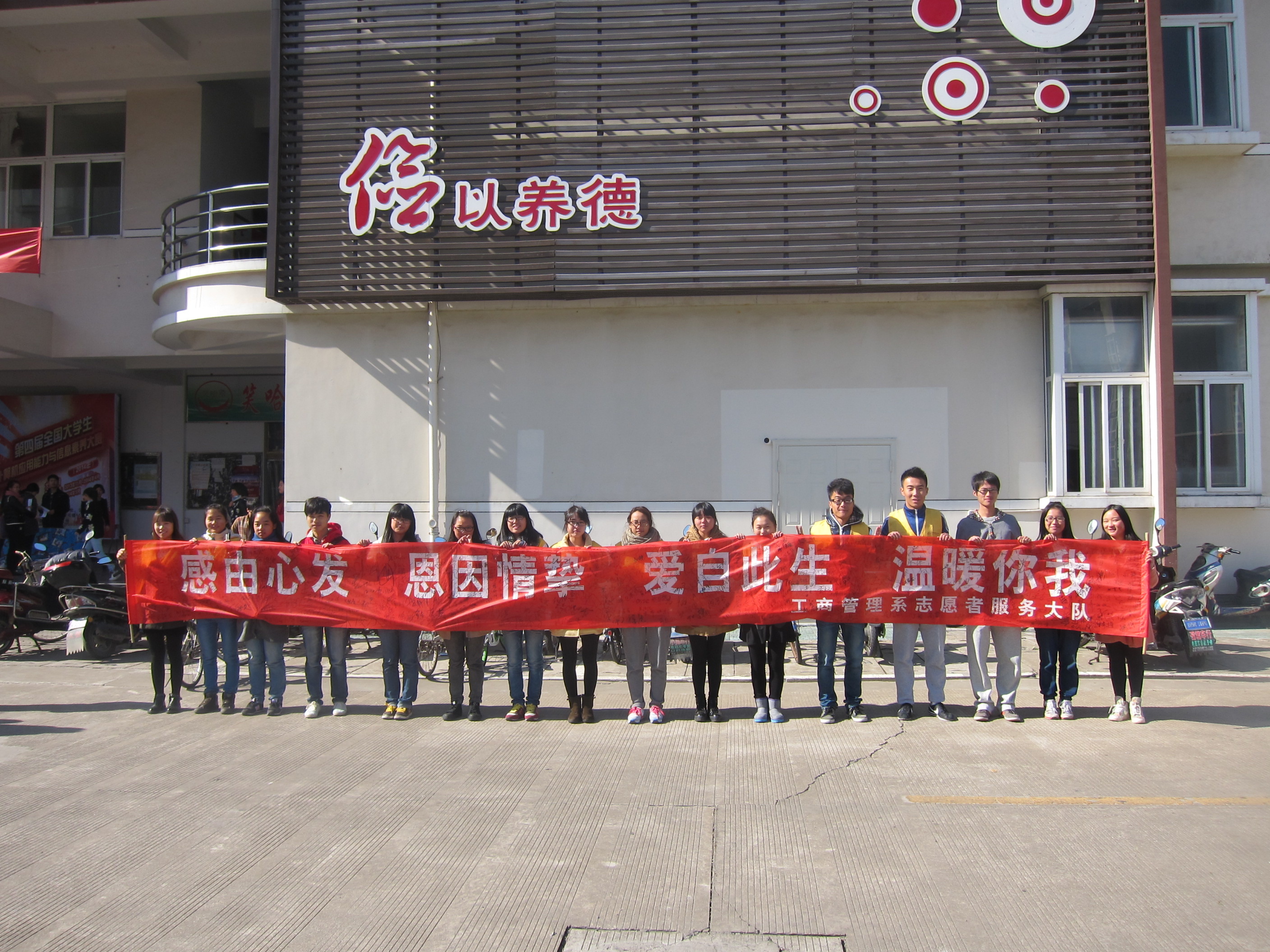 2013年11月28日10点,工商管理系志愿者服务大队在宁波职业技术学院餐厅门口举办了以“感由心生,恩因情挚,爱至此生,温暖你我”为主题的感恩节志愿者签名会。志愿者服务大队的干事们以及师生参加了本次面向全院师生的感恩节签名会。