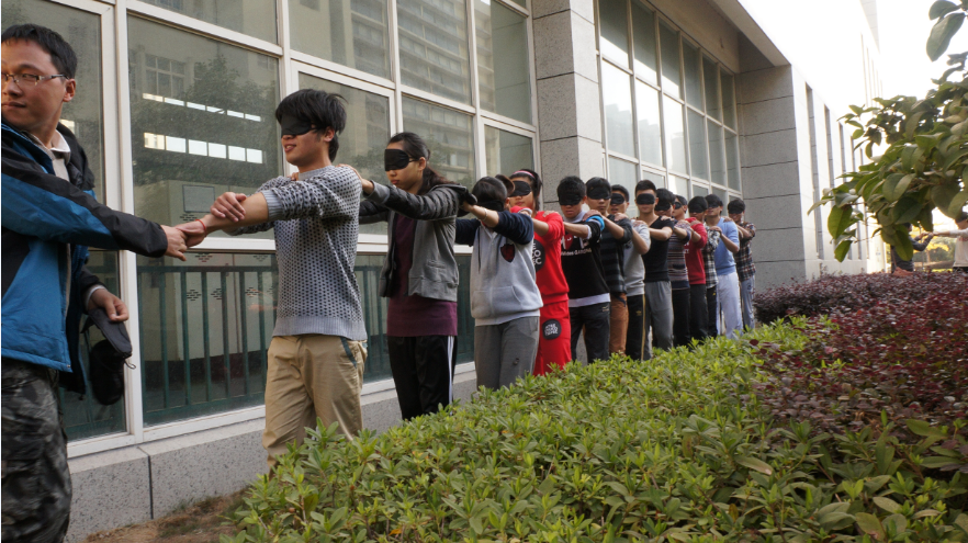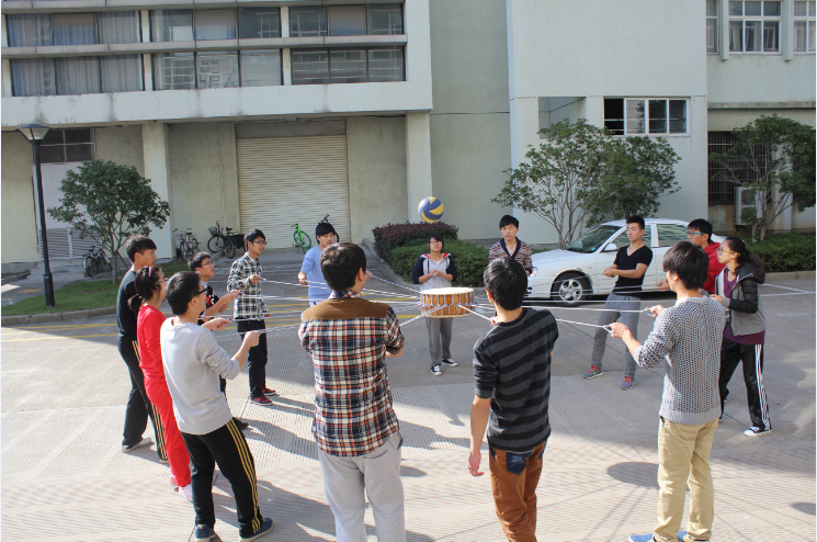早上9点,队员集合完毕,大家组建了两只小分队并选出了各自的队长、队名和口号,同一团队文化,营造团队氛围。此次的素质拓展活动以拓展热身为开端,经过一番简单的热身后,活动正式开始。第一个游戏“击鼓颠球”, 这个游戏对于这两只新组建的小队来说难度很大,如果没有良好的默契与配合是很难完成这项游戏的。经过半个多小时的磨合,取长补短,两支队伍都出色的完成了这个游戏。这个游戏的目的在于培养全体学员团结协作的能力和不怕挫折、不断进取的意识。随着相处时间的增长,队员们之间的默契程度逐步上升。接下去的几个游戏中,在老师们的指导及队友的协作和激励下,两支小分队都顺利完成了盲人方阵、速度记牌和八仙过海三个培训项目。每个项目结束后,队员们分享体会,分析现状,寻找差距,总结经验。