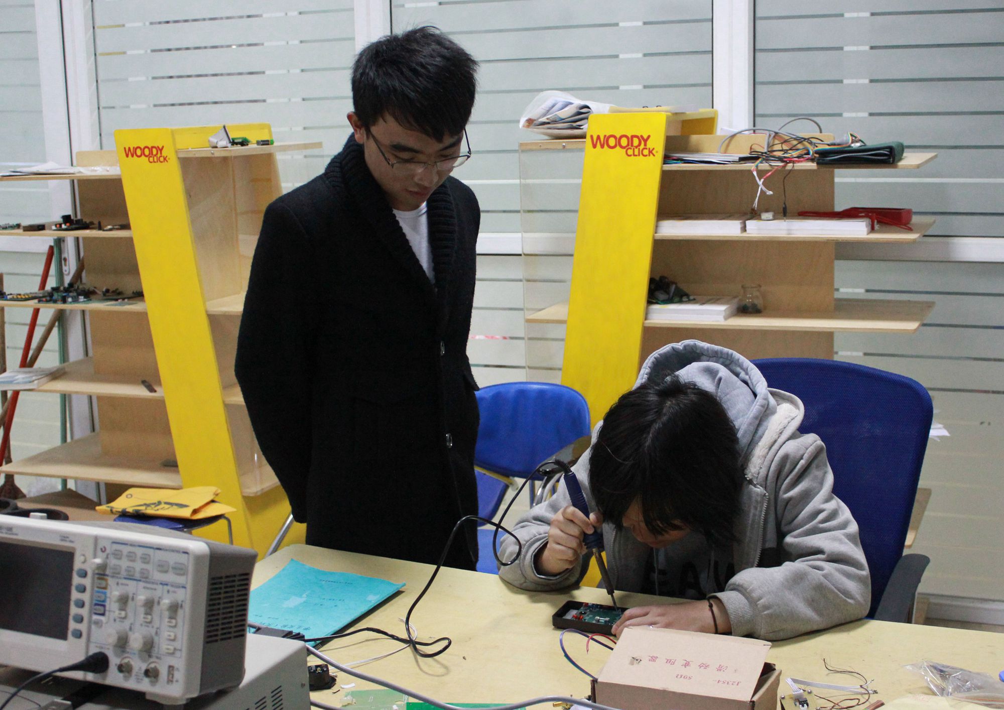 图为:高工正在焊接电路板