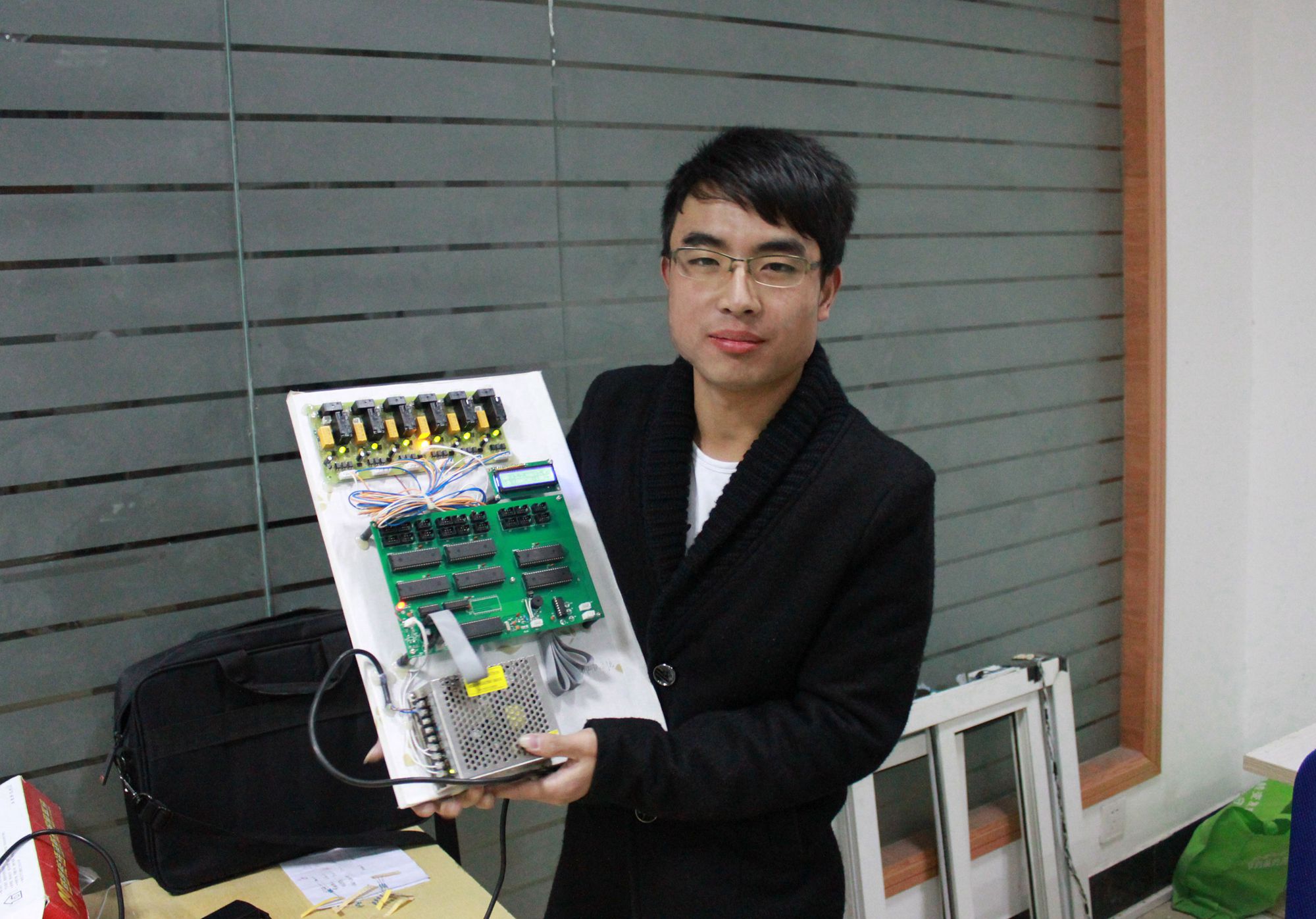 谈话间高工还给我们展示了他的作品,例如他自己组装的“电瓶容量自动测试系统”这是一个在维修电瓶时用到的工具,现在正处于测试阶段,很快就能完工。还有一个也是他组装的四旋翼飞行器,是去年参加比赛时使用的,现在也用于系里的某些航拍活动。