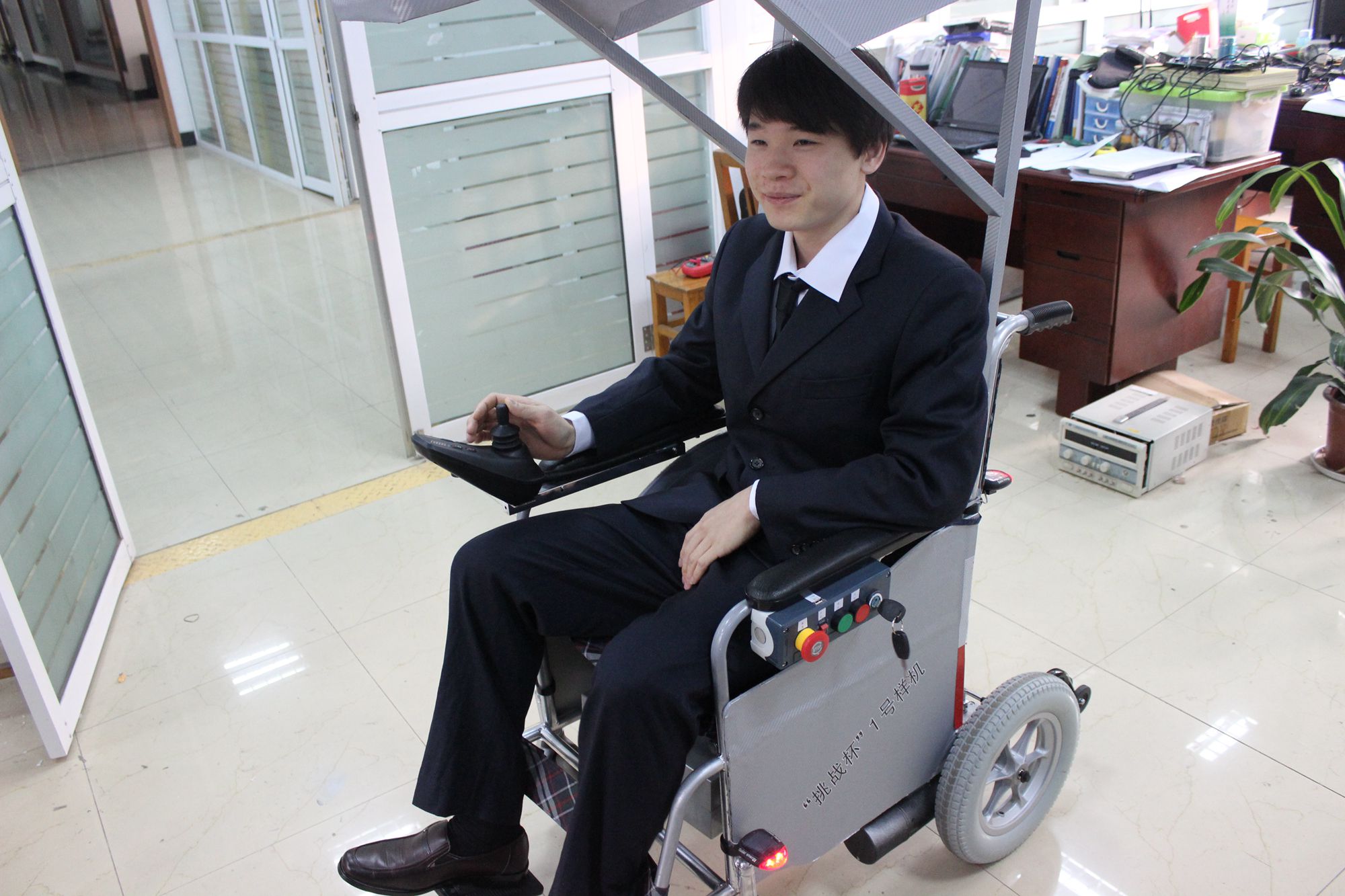 “往前开、向后退、往左、往右……”随着口令和机械马达的声音,一辆造型独特的轮椅出现在记者眼前;伴随着操作人员右手中的摇杆转动,轮椅按照操作人员指示缓缓的做着前后左右移动的动作指令。