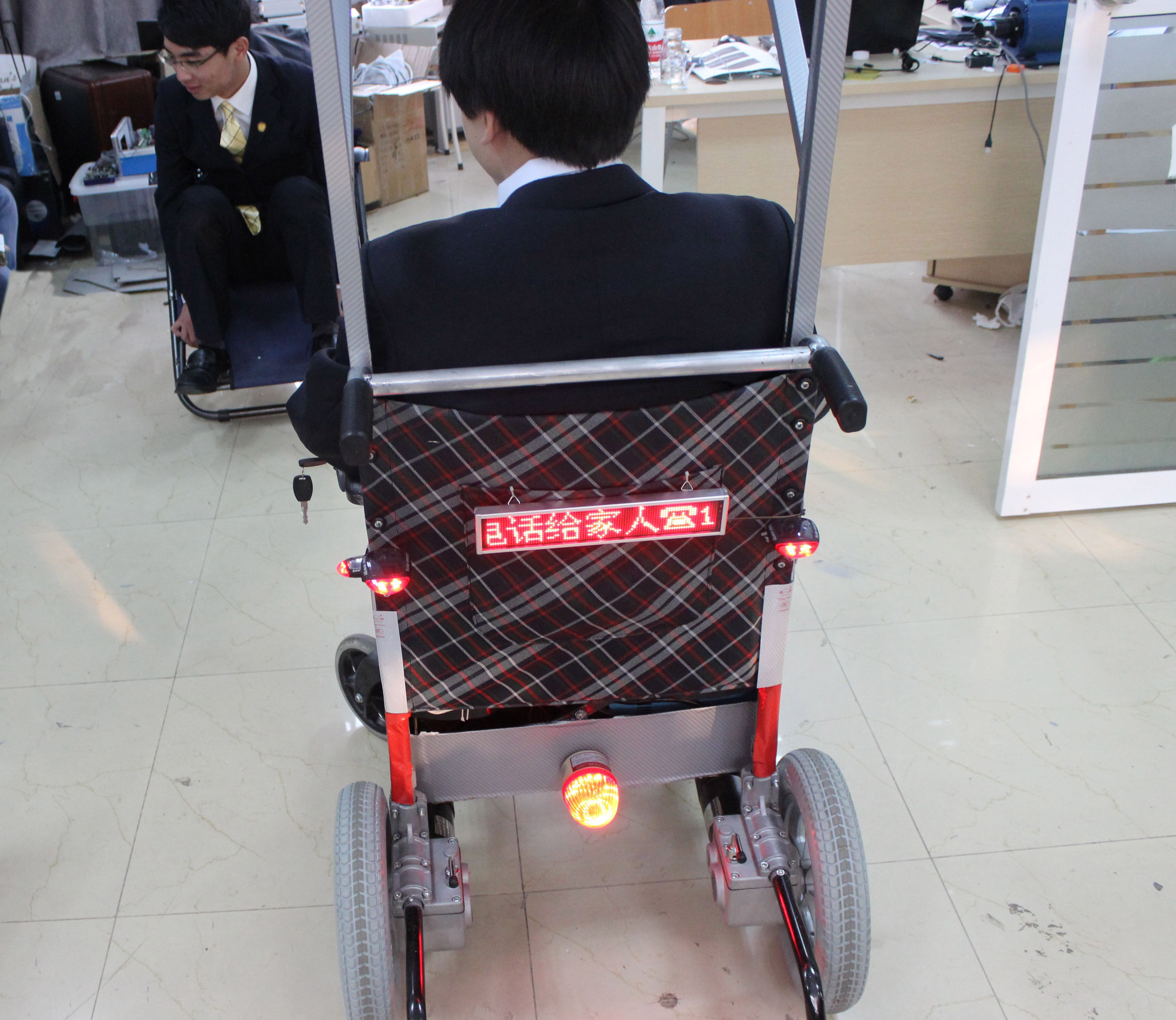 “这款多功能智能轮椅性价比高,操作简便:可以直接应用于已有的手动轮椅,对其进行改进和升级,通过简单的改造就可以实现智能化的电动轮椅。可广泛应用于家庭、医疗单位、公司、学校、敬老院、公共服务部门、旅游景点等各类需要使用轮椅的地方,自动化程度高,可降低人工劳动强度,体积小,重量轻,操作方便,工作安全可靠,并且提供意外报警服务,用得放心送给家人一份温馨,具有很大的市场推广应用价值。”研发团队负责人戴之幸说。