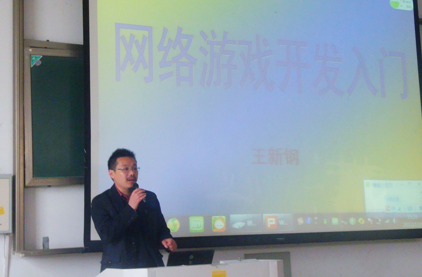 图为:王新钢总经理正在为同学们介绍网络游戏开发入门