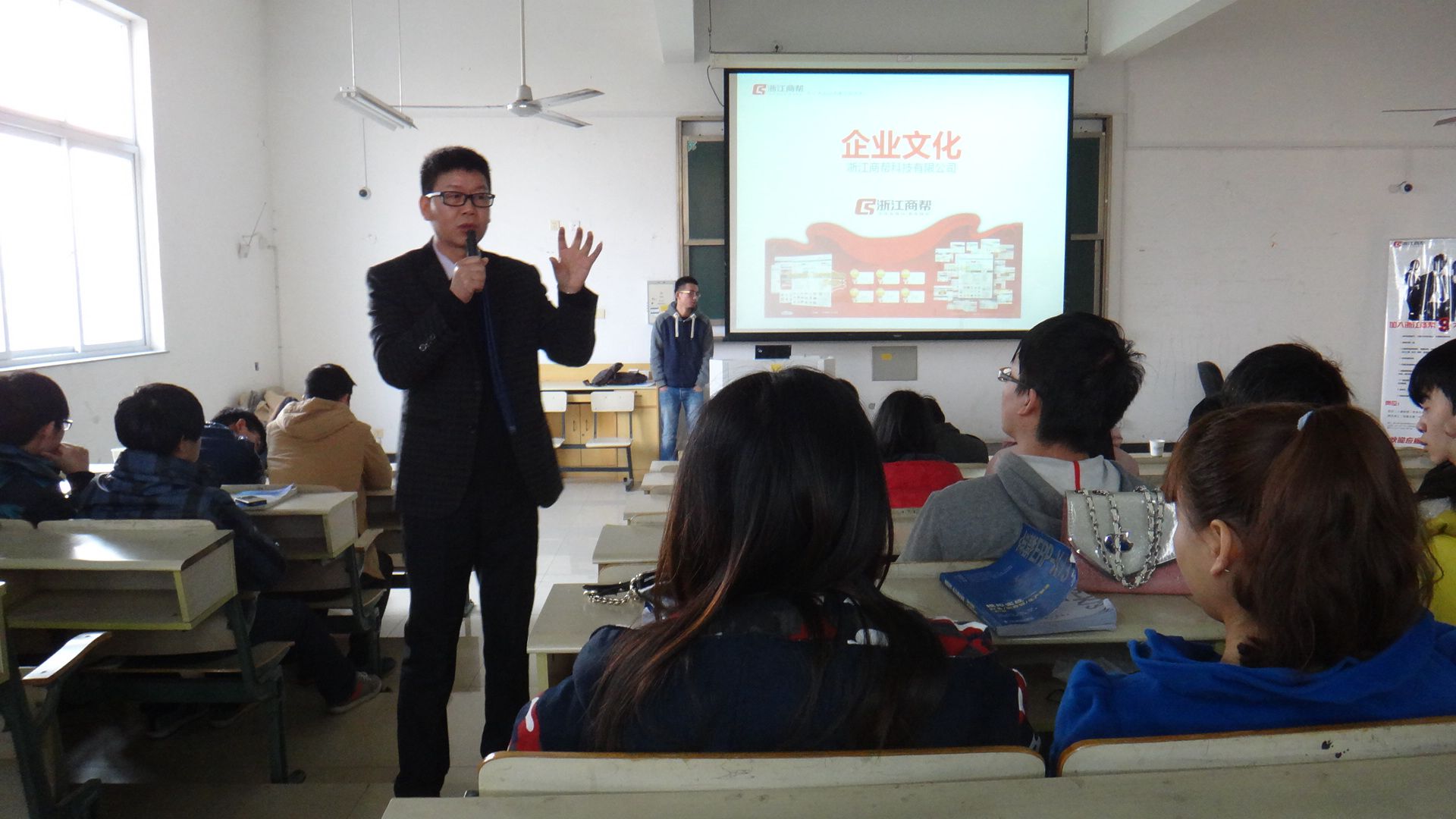2013年12月11日下午3点,电子信息工程系商帮宣讲会在精技楼401召开。本次大会邀请到了浙江商帮有限公司商务总监陈小华和总监卓韦红。出席此次大会的有电子信息工程系计算机专业主任孟德欣副教授、计算机网络技术专业负责人李如桃。