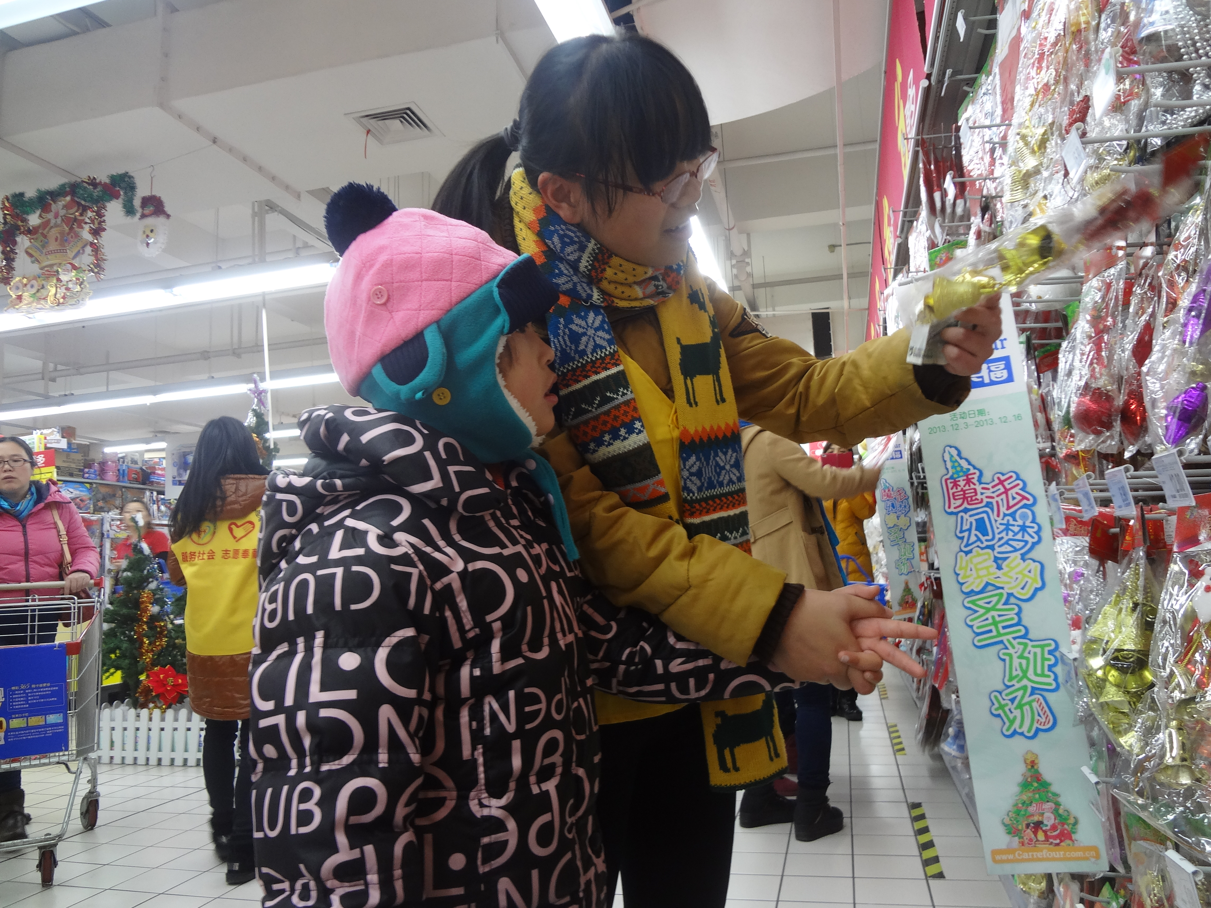 12月19日中午12:30,由蔡婷婷同学带领志愿者服务大队前往北仑区阳光学校,与小朋友一起体验了一次生活之旅。一到学校,负责人蔡婷婷同学将志愿者们依次分配到各个教室。已有初次经验的志愿者们,照顾小朋友们也变得得心应手。此次,由志愿者们带领小朋友们外出体验冬天,体验购物。在途中,志愿者们细心地向小朋友们讲述冬天里景致,让小朋友们在亲身体验中认知新事物。教小朋友们唱歌,猜谜,一路上充满了欢声笑语。随后,到达目的地----家乐福超市,志愿者们进行一对一的带领,与小朋友们一起购物。此间,他们通过商品的价目教小朋友们识标价,算数,并且教他们各种商品的名称,小朋友们沉侵在购物的乐趣之中。