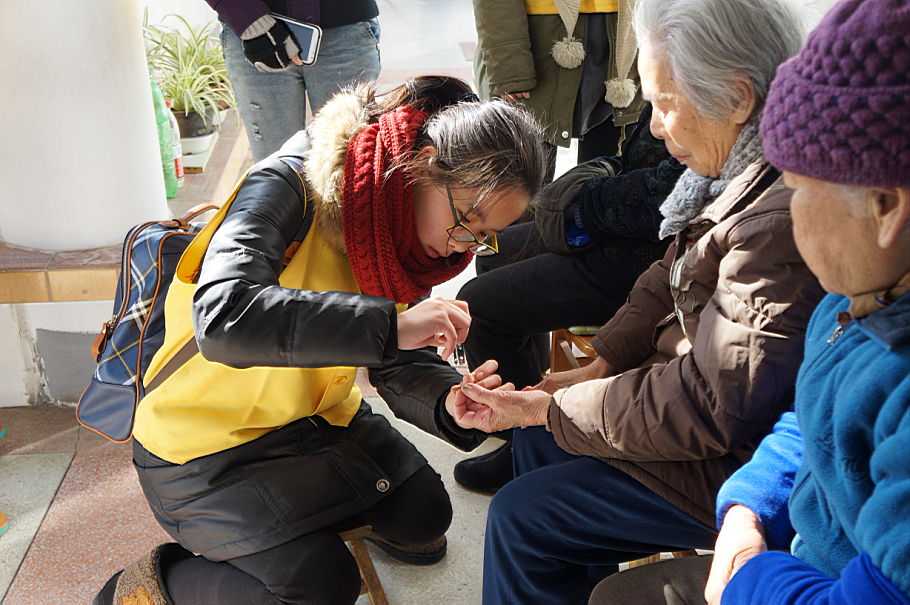 此后,志愿者与福利院的老人们聊着家常,为老人剪指甲,打扫房间卫生等等。老人们虽然衣食无忧,但亲人都不在身边,平时访客也少,却时常感到寂寞;对于志愿者的到来,他们有说不完的话,有道不完的情,有停不了的笑。