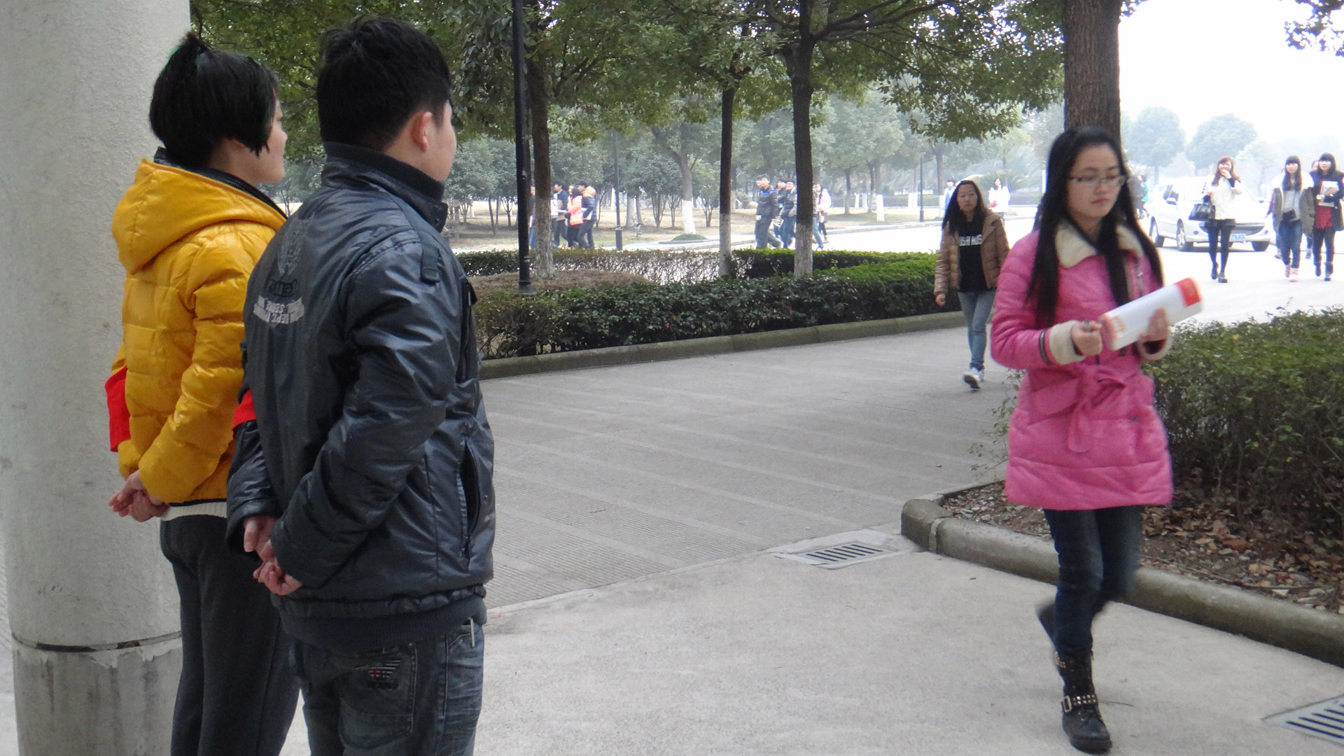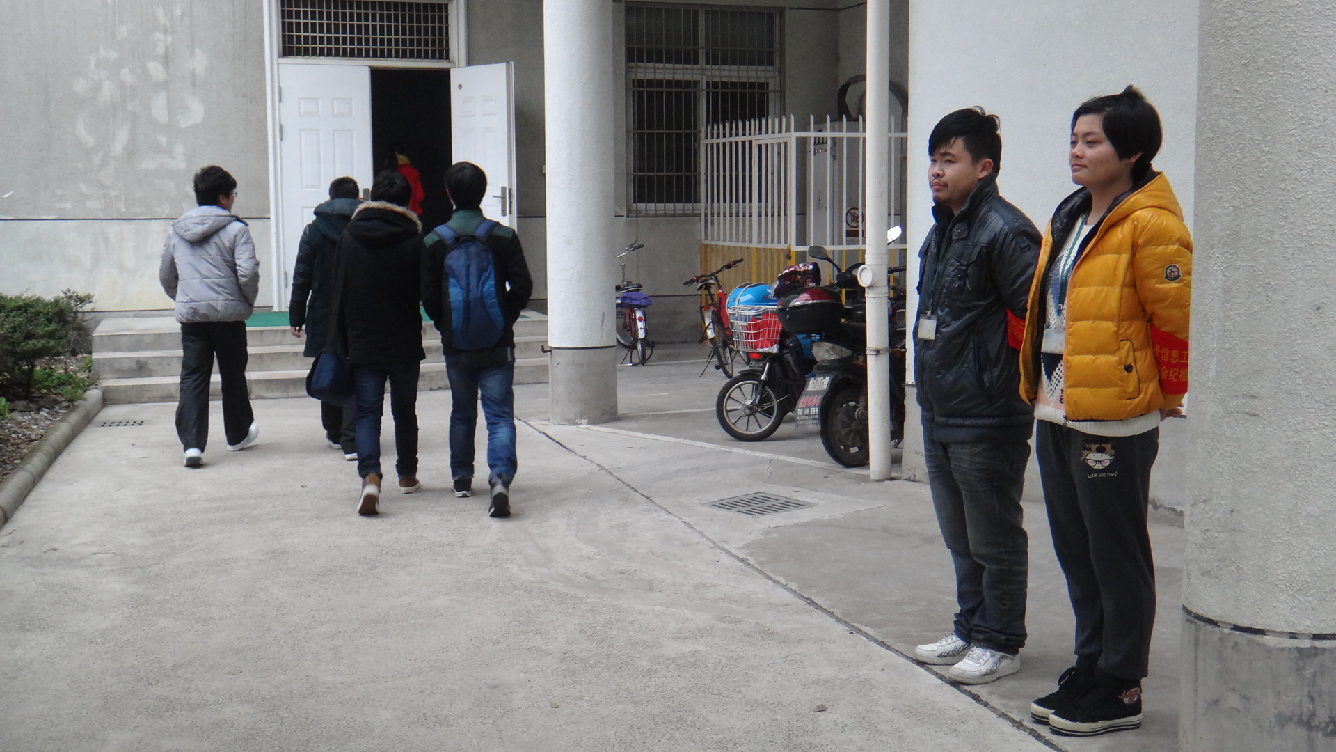 24日早上8点,天气有些寒冷,为了解第一天上课同学们的出勤情况,在敬业楼门口我系纪检部的同学早已站在岗位上,提醒学生不携带早餐、零食进入教室;督促同学不迟到、早退。