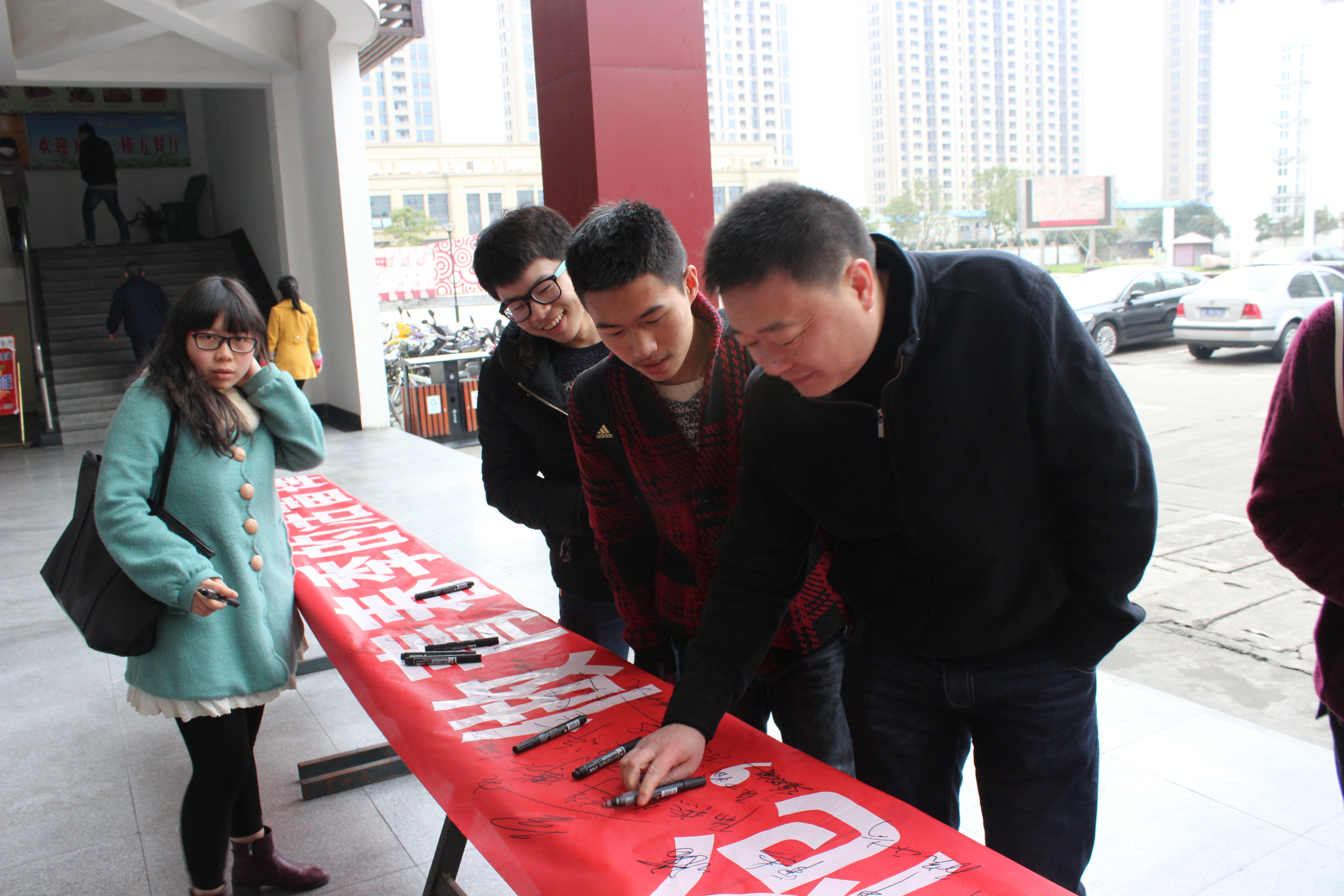活动开始前,学生会的同学们早早的便准备好了活动的横幅、KT板和海报。11点30分食堂的人流量开始增多,负责此次活动宣传的宣传部部门干事卖力的向过路的同学们宣传活动的主题内容,号召同学们学习雷锋精神,并希望同学们在横幅上签名以表示对活动的支持。了解到此次活动主旨的老师和同学们纷纷响应,拿起笔签下自己的名字。