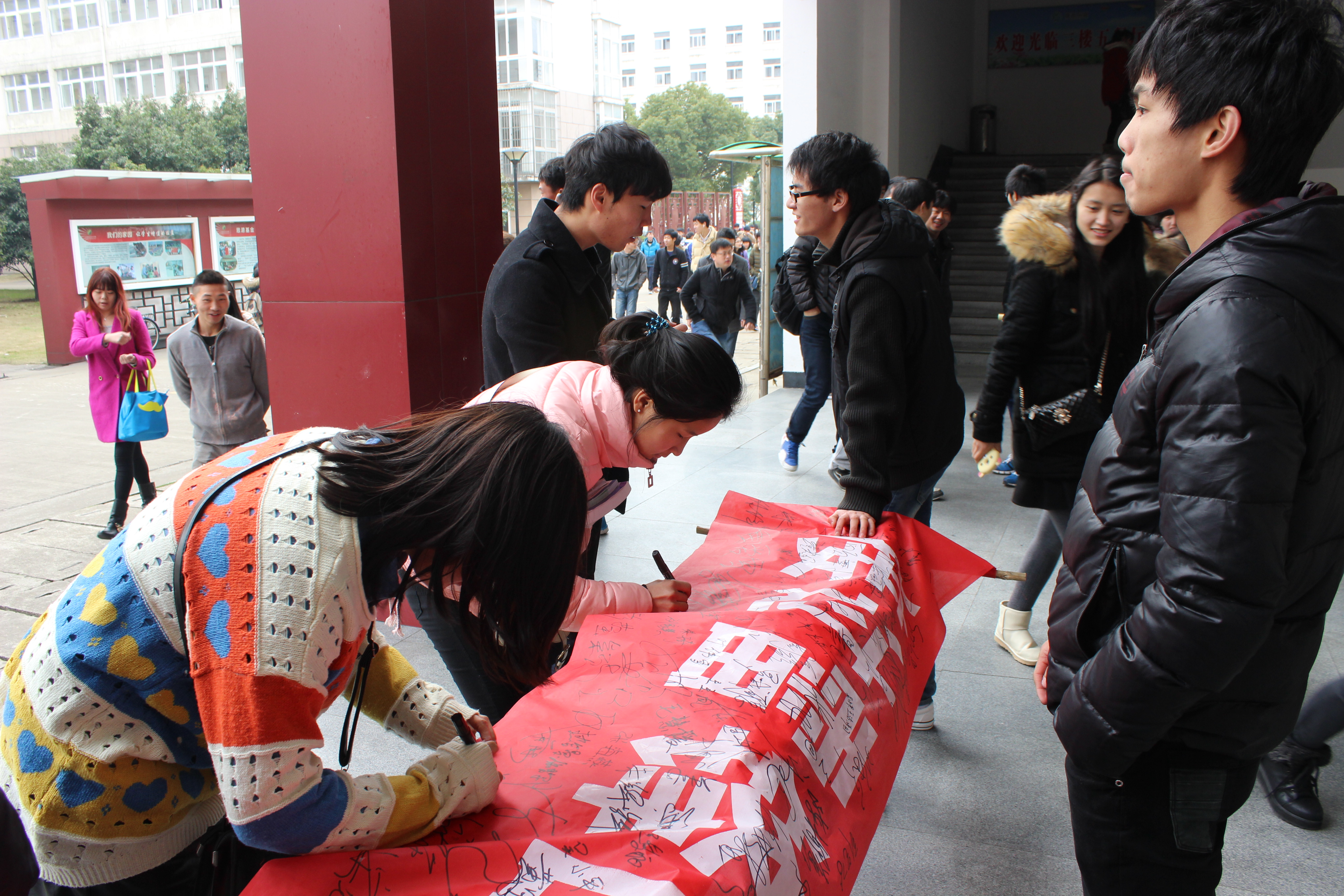 3月5日是毛泽东同志题词“向雷锋同志学习”51周年纪念日,为了深入贯彻落实党的十八大精神,团的十八届三中全会精神,进一步弘扬和培育民族精神,加强和改进大学生的思想政治教育,构建和谐校园,积极响应院团委下发文件精神,3月5日中午11点30分,电子信息工程系团委学生会的同学在学校食堂门口举行了以“立行雷锋精神,展示青春服务,释放90光芒,肆染青春朝华”为主题的横幅签名活动。
