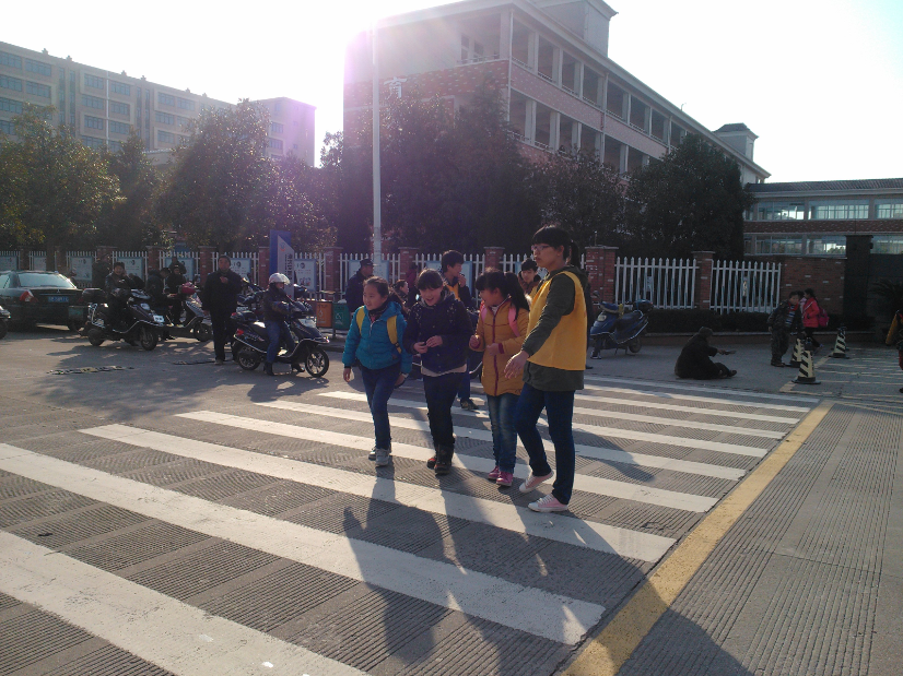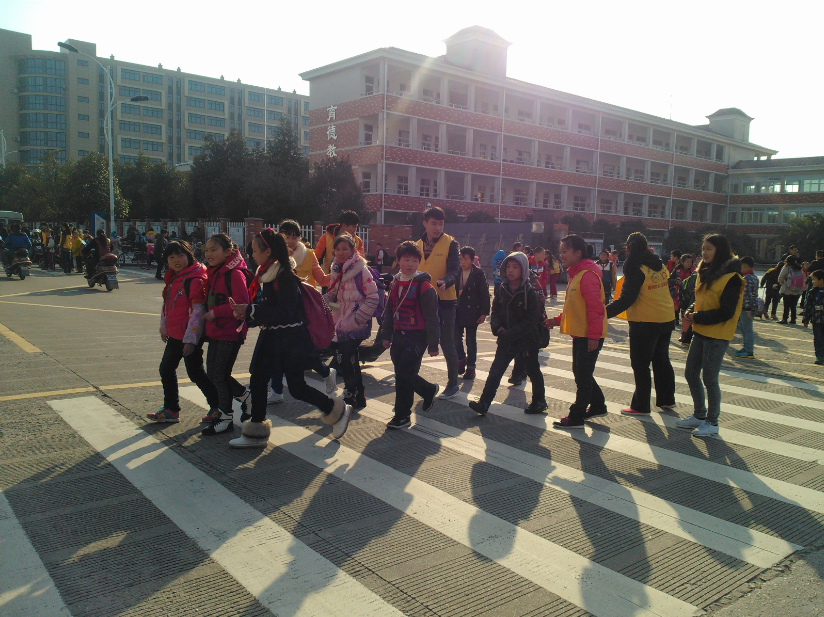 博平小学位于北仑区大碶学院路,每天车流量较大、车速快,虽然设置了斑马线和减速带,但频现“中国式过马路”,依然存在交通安全隐患。志愿者们分成6组,每组4人。其中3组人在校门口引导孩子过马路,另3组人在各个路口维护交通秩序。下午3点半,正值下课高峰期,孩子们蜂拥而出,志愿者们上去引导,把一批又一批的孩子安全护送到马路对面。当看到几个调皮的男孩边走边玩时,志愿者忙前去劝阻,并告诉他们在马路上玩耍是很危险的。在另几个路口,尽管当天天气寒冷,但志愿者们依旧坚守着岗位,认真指挥交通,制止违规不文明的行为,协助维护交通秩序,成了一道亮丽而独特的风景。