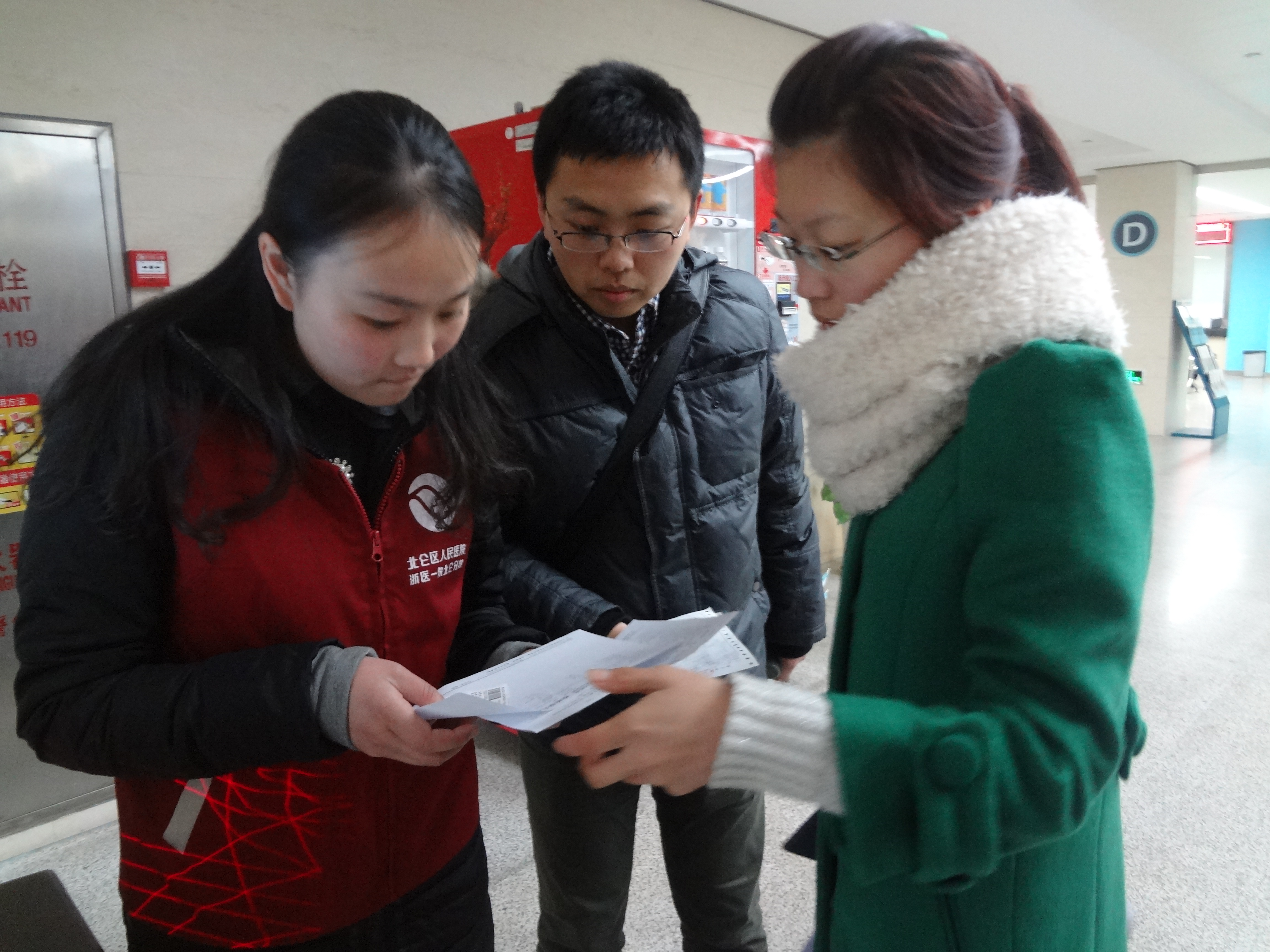 为了传递爱心,提高同学们的奉献精神,2014年3月8号中午,在工商管理系团委学生会志愿者服务大队的带领下,志愿者们冒雨来到了北仑人民医院进行导医活动。 首先,志愿者们被分为了三组,他们分别在输液大厅帮输液的人们拿吊瓶,在自动挂号机前辅助人们挂号,在自动验取报告机旁帮人们拿取化验单。
