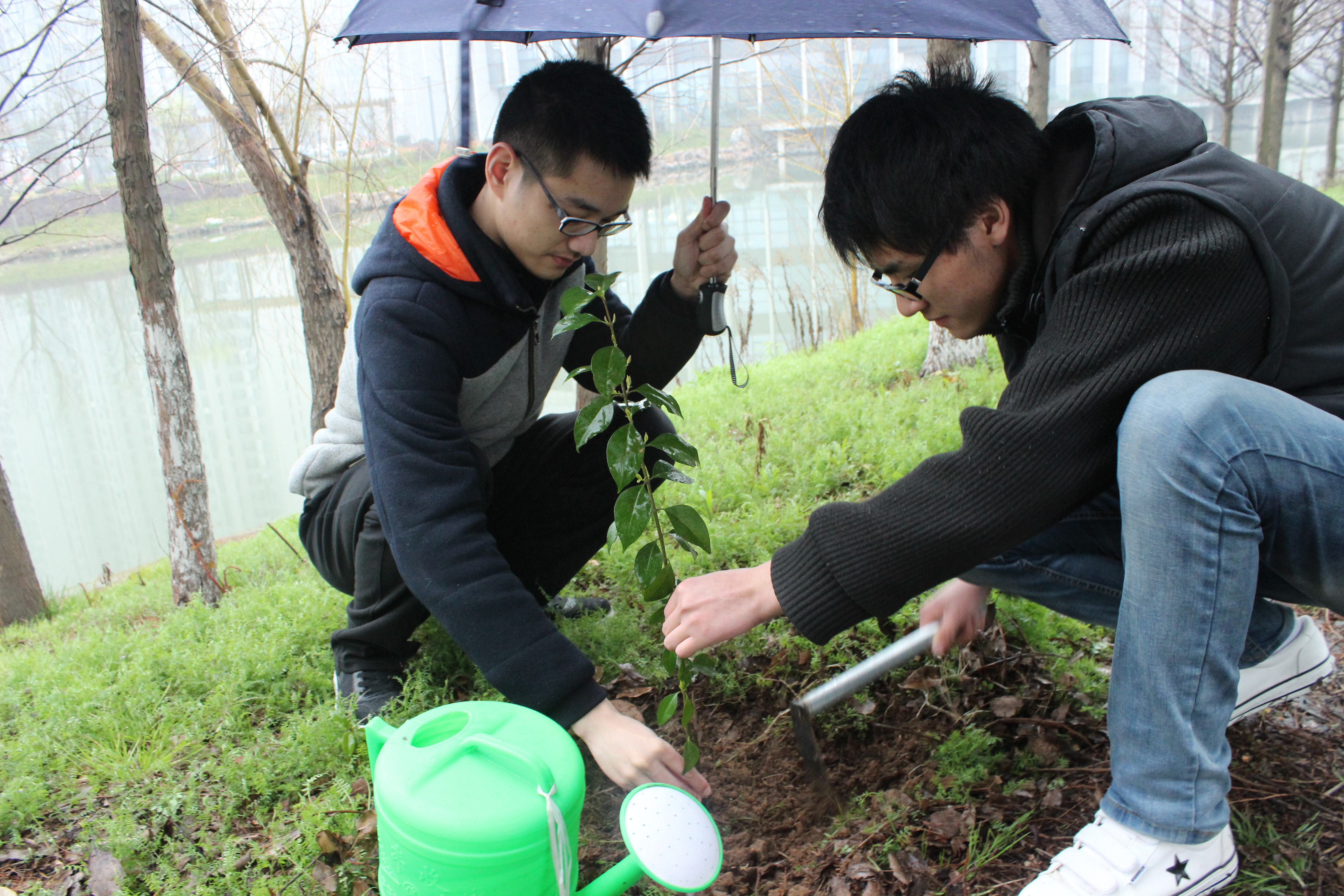 12日下午3点,各部门助理在敬业楼下集合,在所有人员到齐后主席助理赵涛开始给大家分发工具和树苗并跟在场的各部门助理讲解我们此次种树的目的,以及在种树过程中需要注意的事项。在所有物品分发和事项交代完毕后,大家开始各自分散寻找合适的地点开始种树。
