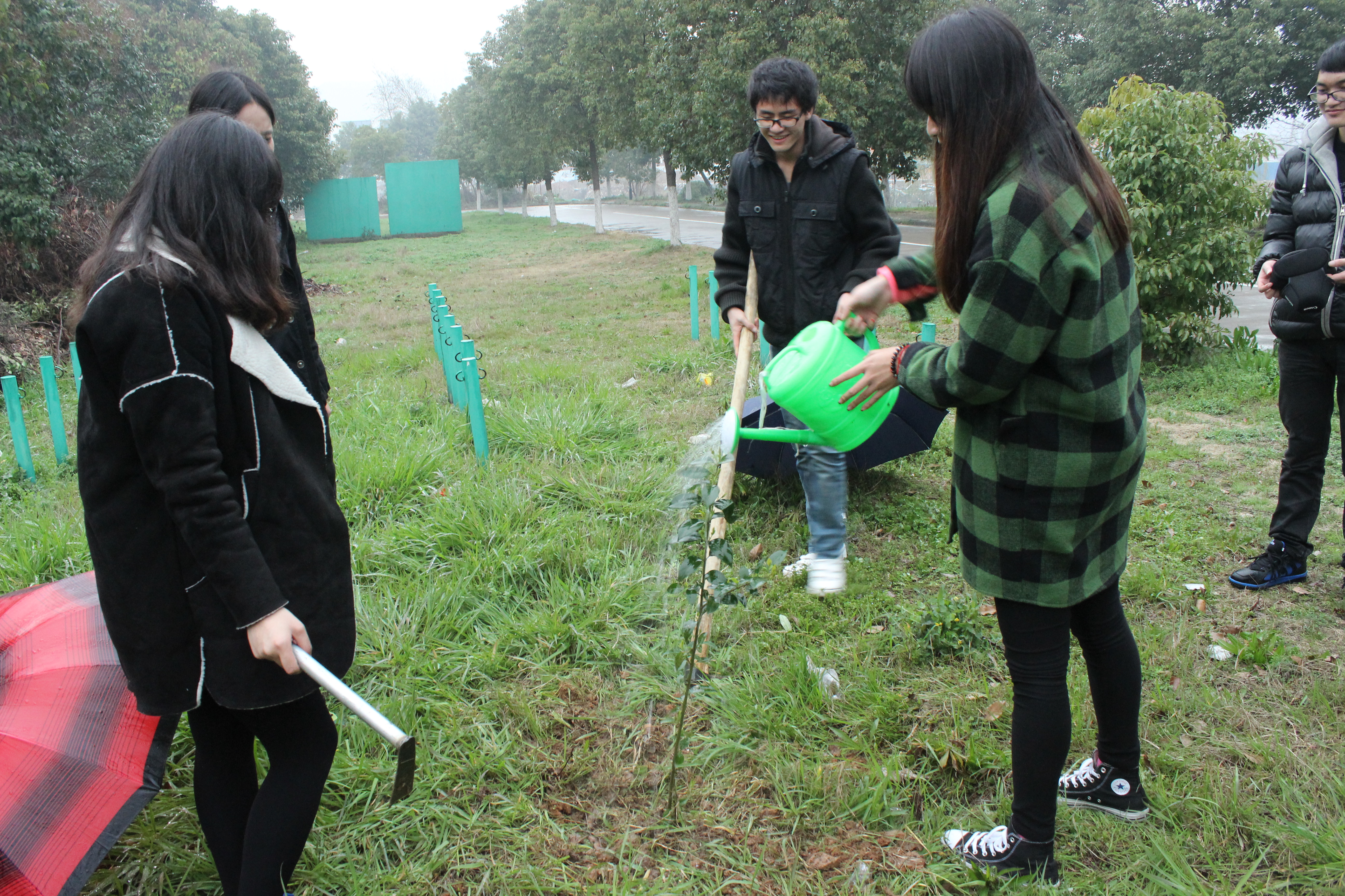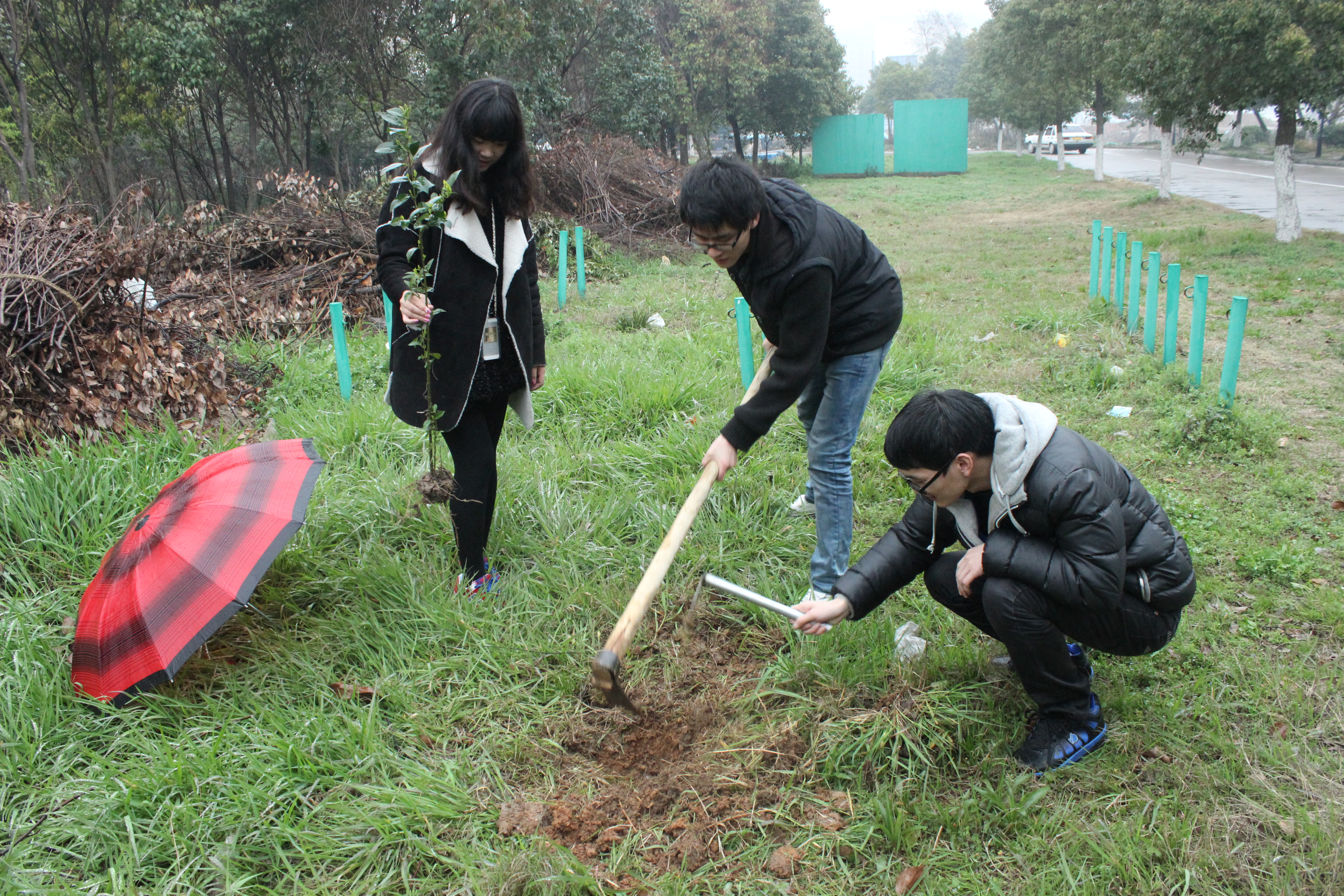 在找到各自种树的地点后,各部门助理们开始除草、挖土,一时间种树地区一片热闹的景象,助理们将一颗颗充满生机的香樟树树苗植入地下。再此过程中,主席助理赵涛也不断的和部门助理们交流如何动员部门干事多参加社会实践、多做公益工作。整个植树活动井然有序,虽然天空中还时不时飘着细雨,但助理们仍然干劲十足,经过一个多钟头的努力,终于完成了植树任务。