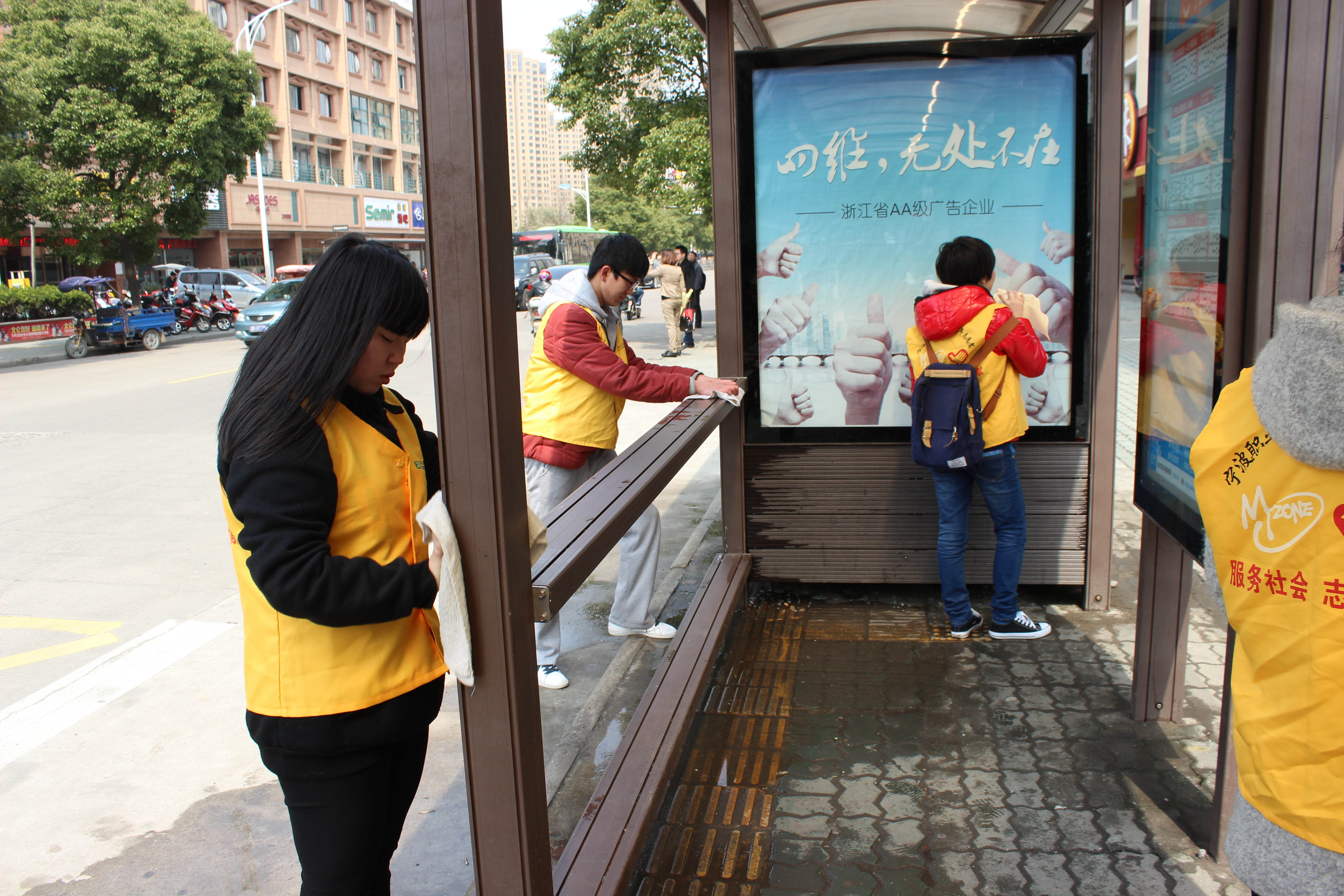 3月13日,为积极响应我系“雷锋月”活动,号召学习雷锋精神。电子信息工程系学生会志愿者部于13日下午1点组织我系10名志愿者对学院周边的公交站台进行清洗。