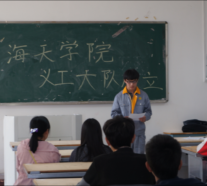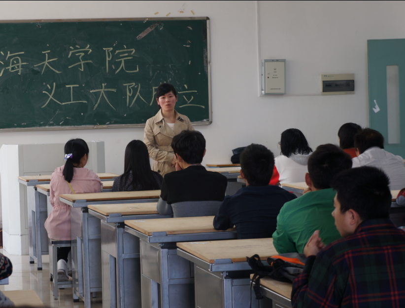 首先,陈姜帅老师向在场的志愿者们介绍了我分院义工大队的组成以及工作宗旨。本支义工大队海天小分队是由我院150名贫困生组成,他们在接受社会帮助的同时也用自己的力量去回报社会。随后,分院党总支副书记王灵玲老师为本支义工大队致辞,并希望我院义工大队不断深化志愿服务内涵,打造志愿服务品牌,大力弘扬“奉献、友爱、互助、进步”的志愿精神,将专业知识与社会实践相结合,努力成为爱心善行的传承者、志愿服务理念的普及者和社会主义核心价值观的践行者。
