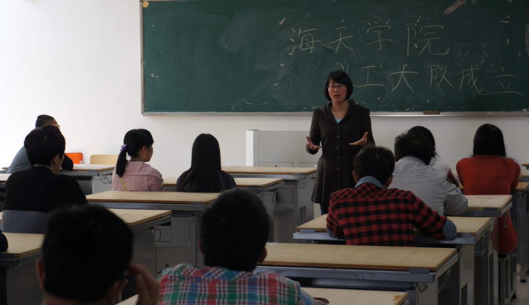 伴着授旗仪式的音乐,张日益老师将海天义工大队旗帜递交到义工代表的手中,宣布义工大队正式成立。“志愿者服务的重要性在于其社会影响力。它不仅提供了一个体验志愿服务的精神魅力的平台,更代表了大学生服务社会、贡献社会的精神面貌。”张老师表达了自己对大学生志愿活动的看法,“在志愿者大队里,希望大家能够增强使命感,思考怎么样工作,能为学生、社会带来些什么,而不是简简单单的一个志愿者。而且,在一些关键时刻,我希望走在最前面的是我们。”