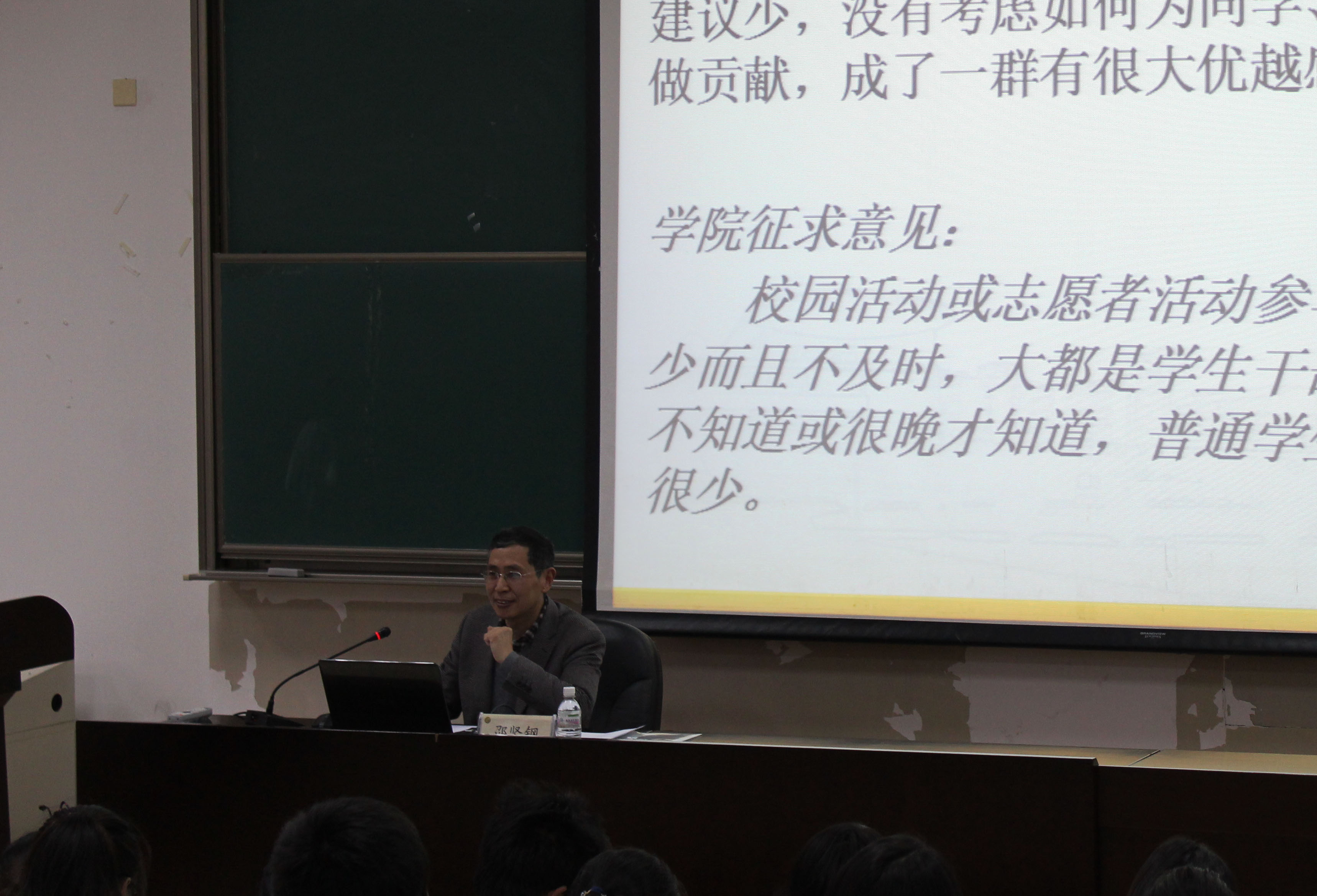 接下来,邵坚钢老师用苏联亡党亡国的一个重要原因就是贪污腐败、特权,党风败坏、严重脱离群体来表现当今社会存在的缺点:一、“人民当家作主”演变成“替人民当家作主”;二、特权、腐败使领导者渐失人心;三、利益“共同体”与群众越来越疏远;四、国家经济掌握在少数人手中。通过这四点问题,邵书记指出我院学生干部存在的不足为与同学交流沟通少,听取同学意见建议少,没有考虑如何为同学集体多服务、多做贡献,成了一群有很大优越感的特殊群体。