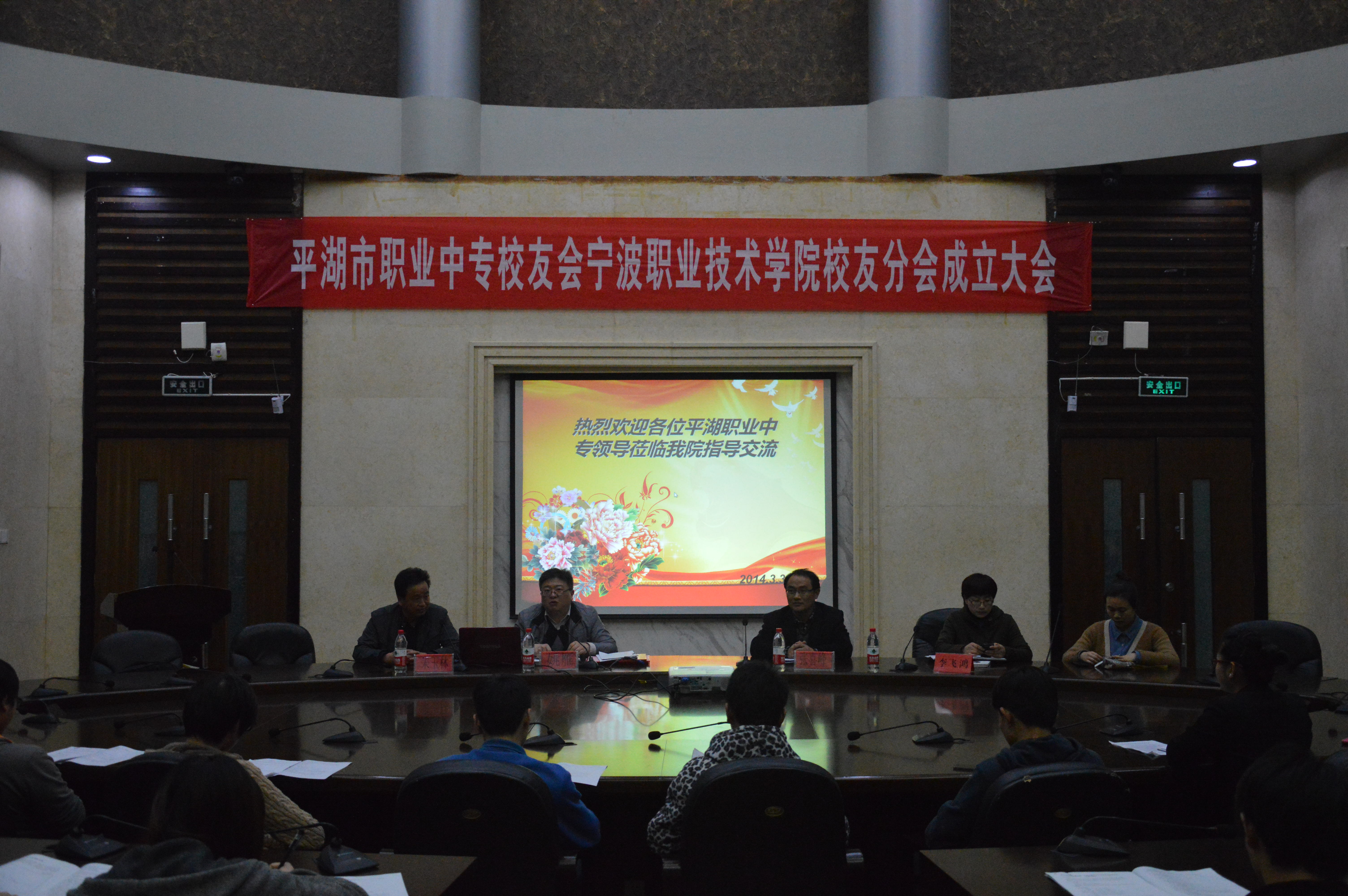 3月31日,首届“平湖市职业中专校友会宁波职业技术学院校友分会成立大会”在我校国贸楼国际会议厅容重举行。参加本次大会的领导我校李飞鸿主任、平湖市职业中专党委书记张喜峰、平湖市职业中专校长助理姚雁、朱玉林主任,还有我校12、13届从平湖职业中专毕业的学生。图为:校友分会大会成立大会现场