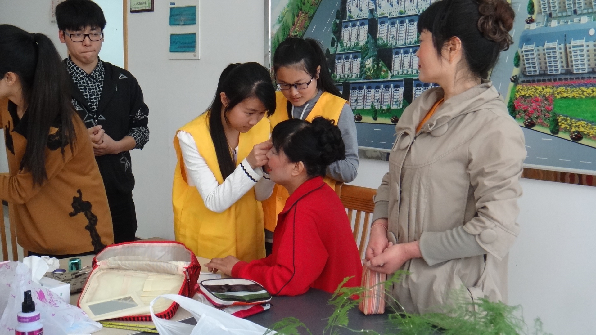 下午3点,志愿者们在志愿者部部长夏威栋的带领下,乘车到达黄鹂社区,志愿者一行人到达后,部长夏威栋向服务工作中心负责人说明了有关情况,社区负责人告诉志愿者,此次请志愿者们帮忙是为了准备黄鹂社区晚间的一个晚会。社区给志愿者们安排了化妆老师,让志愿者学习化妆技巧,并帮助参加晚会的老人化妆。