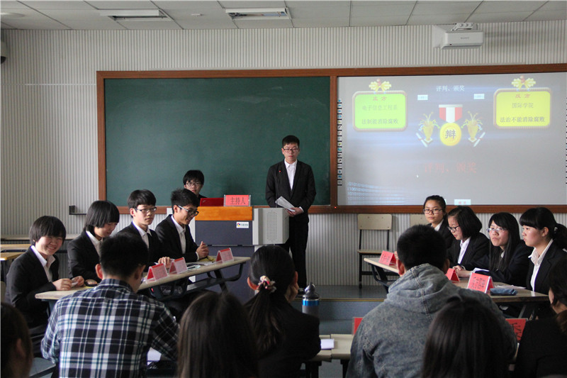 此次辩论赛中,由我院8个系中的电子信息工程系对战国际学院。正方为电子信息工程系,反方为国际学院,本次辩论赛的主题是“法治能否消除腐败”。