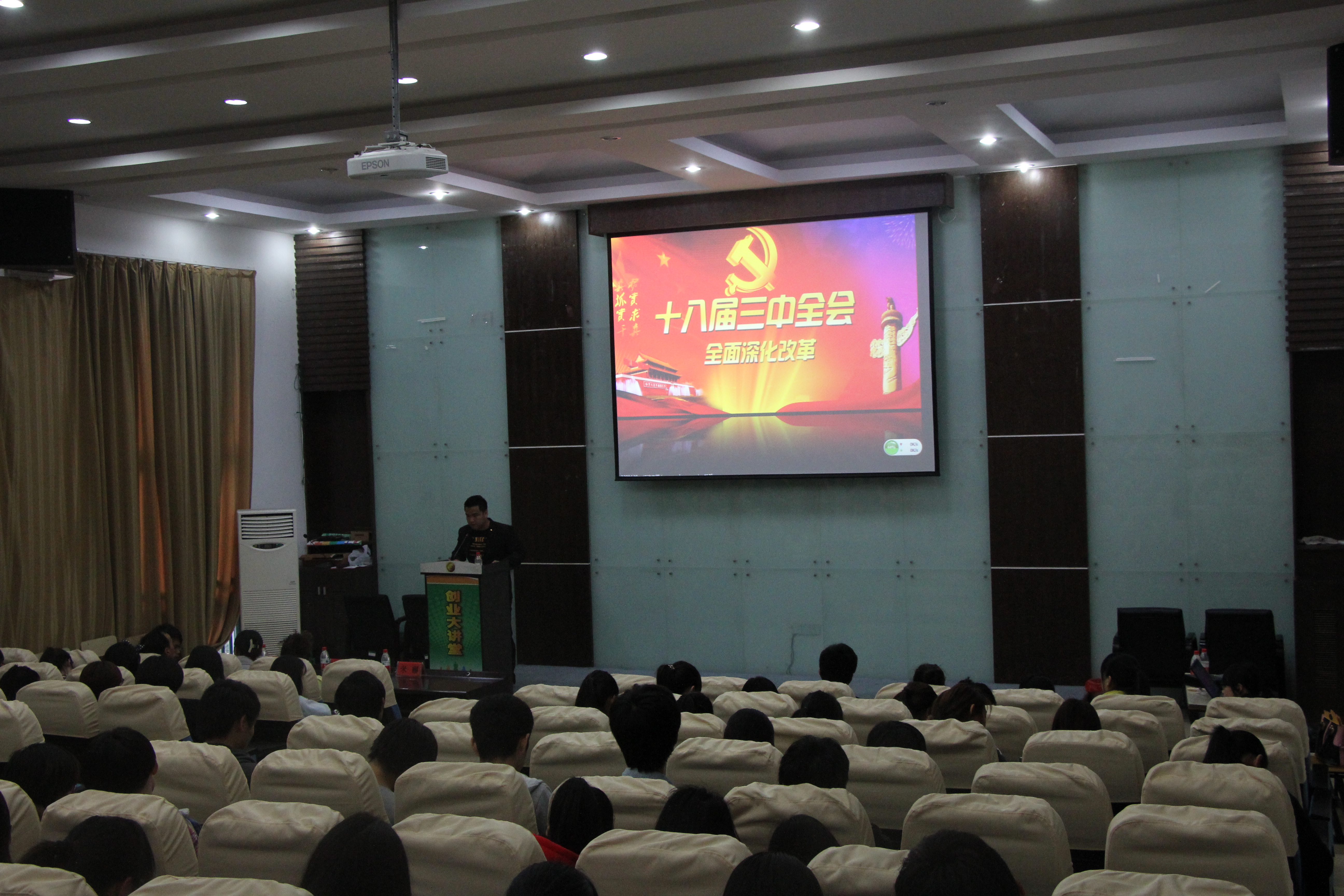 4月15日晚上6点,宁波职业技术学院宣讲团讲座在明德楼105会议室举行,出席本次讲座的老师有思政教研室主任张国艳老师、思政教研室马旭光老师和院团委米娜老师。而此次讲座的主讲人是宣讲团的同学们。十八届三中全会顺利闭幕后,全国上下掀起了学习十八届三中全会的精神热潮,会议明确了改革的基本方向,改革如何落实为解决具体问题的政策,从而释放出改革红利,已成为一个非常现实的命题。所以,宣讲团的同学们借由此次讲座为同学们揭开改革的神秘面纱。
