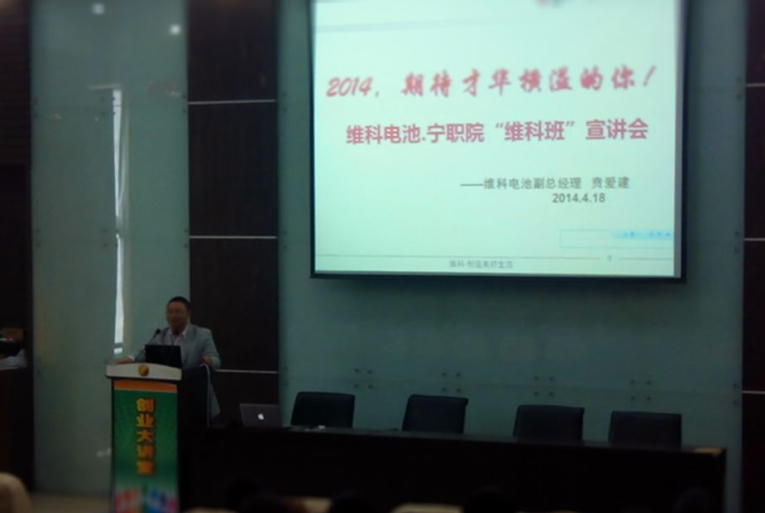4月18日维科电池宁波职业技术学院首届“维科班”宣讲会,在宁波职业技术学院东校区1105教室成功举行。“维科班”是由宁波维科电池股份有限公司与宁波职业技术学院一起合办的,通过共同选人、育人,培养和储备一批学习能力强、充分认同维科文化的优秀应届毕业生,填充到公司各个重点岗位。