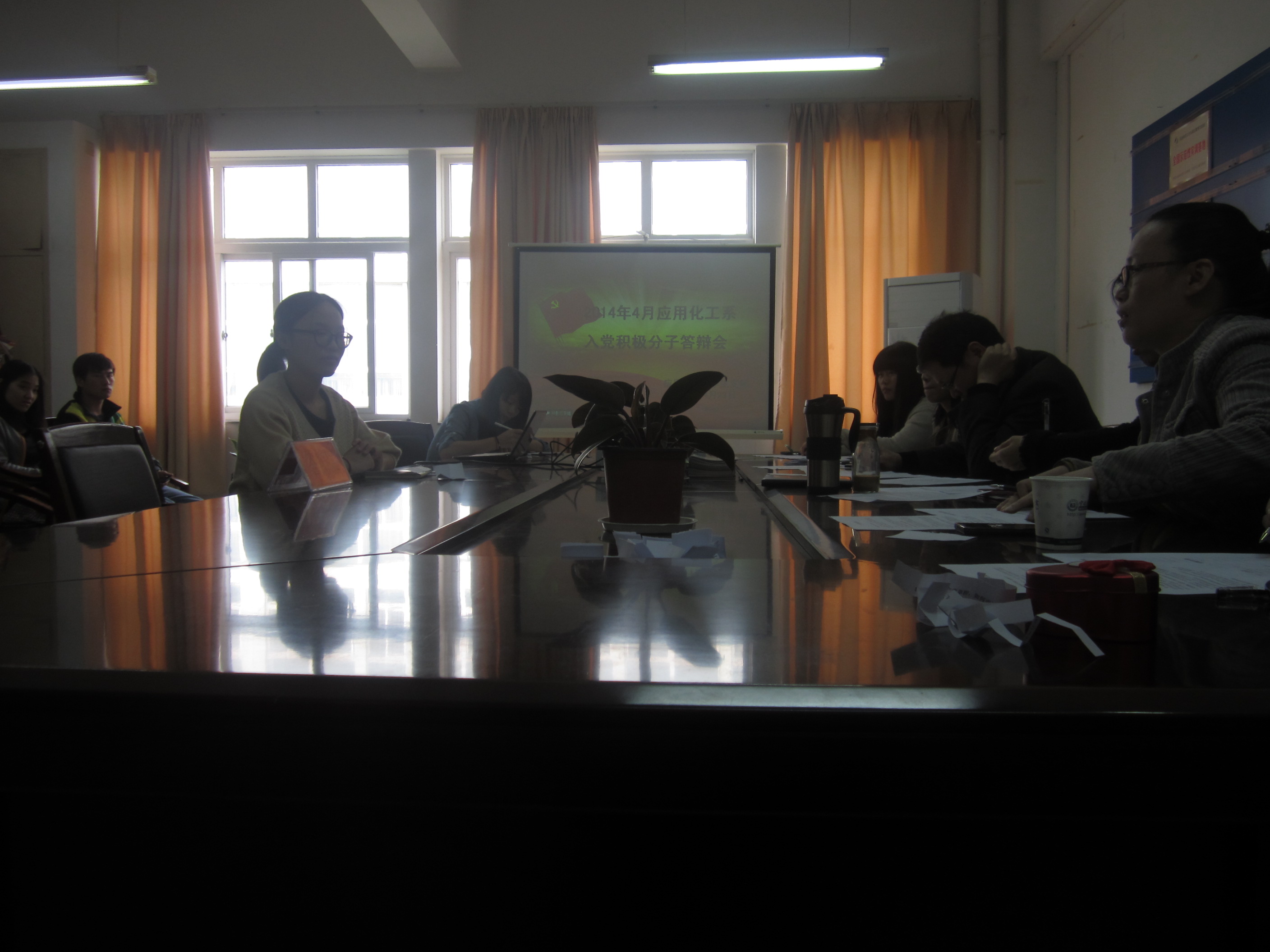 4月23日下午12:15分,2014年应用化工系入党积极分子答辩会在4号楼307会议室举行。应用化工系党总支书记徐帆,应用化工系办公室主任徐迪静,应用化工系就业指导员魏雷及化工系各班入党积极学生参加本次答辩会。会议由党总支书记徐帆老师主持。应用化工系就业指导员魏雷老师对答辩会上入党积极分子的答辩情况进行点评和总结,对开展此次答辩会的背景、目的与意义进行了充分的阐述,他强调入党答辩会是提高党员质量,提高党员自身修养的重要举措,并对要求入党积极分子,答辩会后要继续加强学习,加强党史、党的方针政策、工作中业务知识的学习等,要加强思想建设,端正自我,保持良好的生活、工作作风。