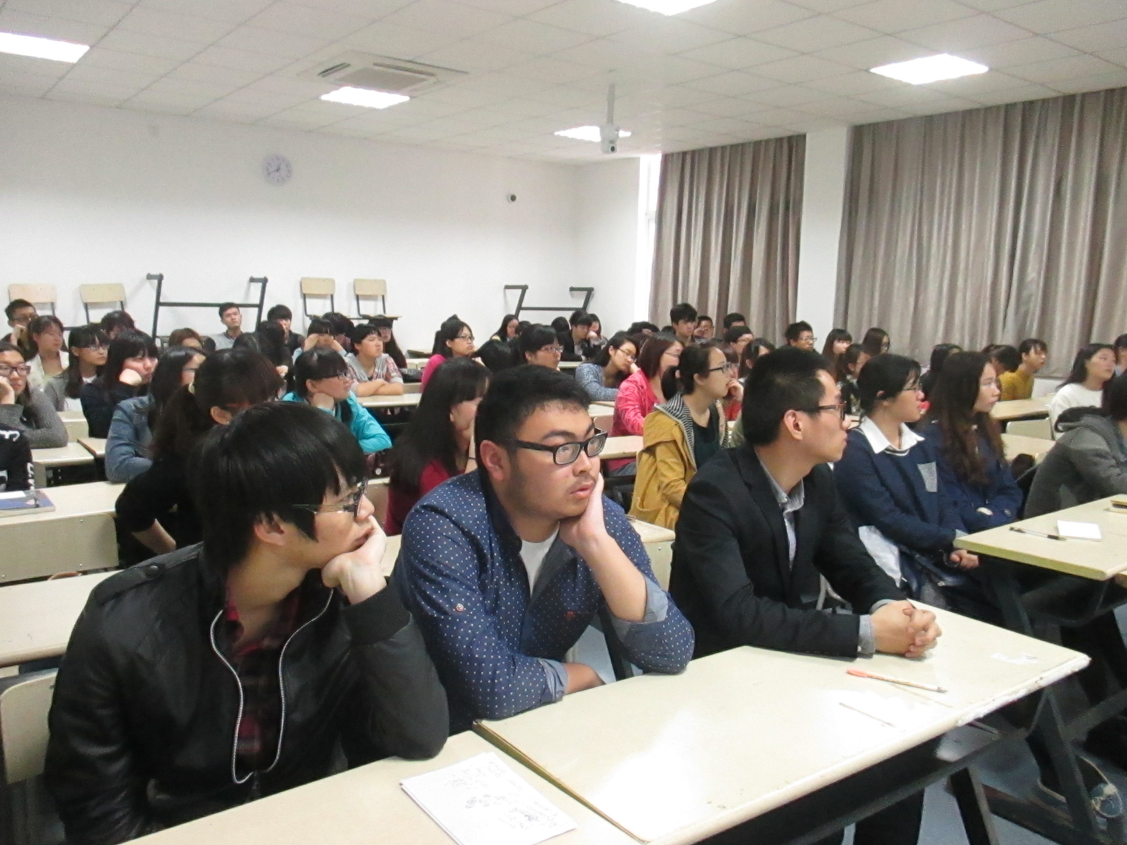 视频播放结束后,陈老师为同学们讲了一些有关学长学姐的成长及商帮的业绩和未来发展。他用诙谐幽默的话语,感染了每个同学,也激励了每个同学的青春力量,整个宣讲会笼罩在轻松愉快的氛围中。期间也有同学们不时站起来提问陈老师关于公司的现状和未来发展,陈老师都微笑着给予回答。