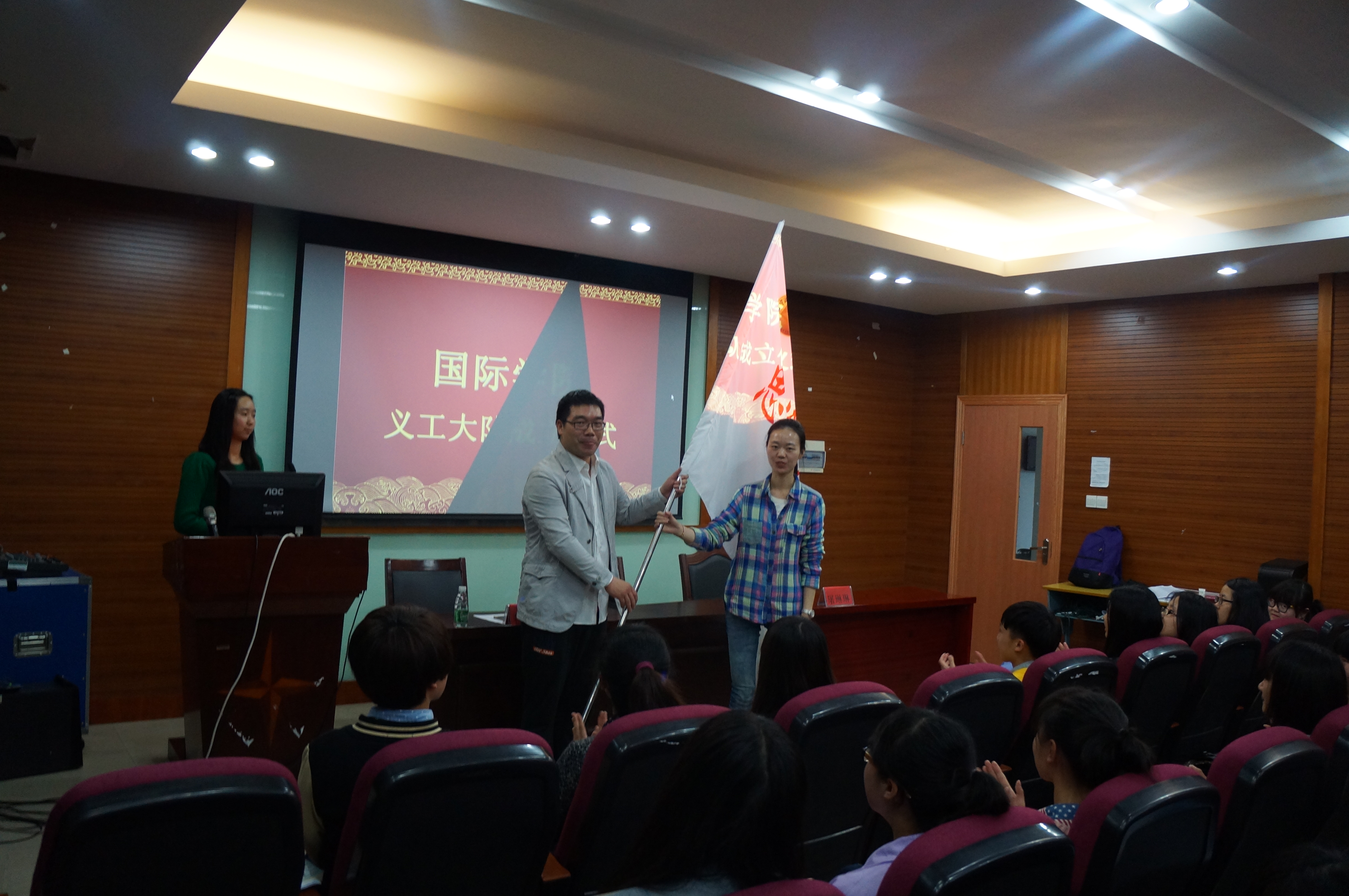 会议第三项,国际学院义工大队授旗仪式。由国际学院学工办主任徐俊杰老师给国际学院义工大队大队长屠玲玲老师授旗。