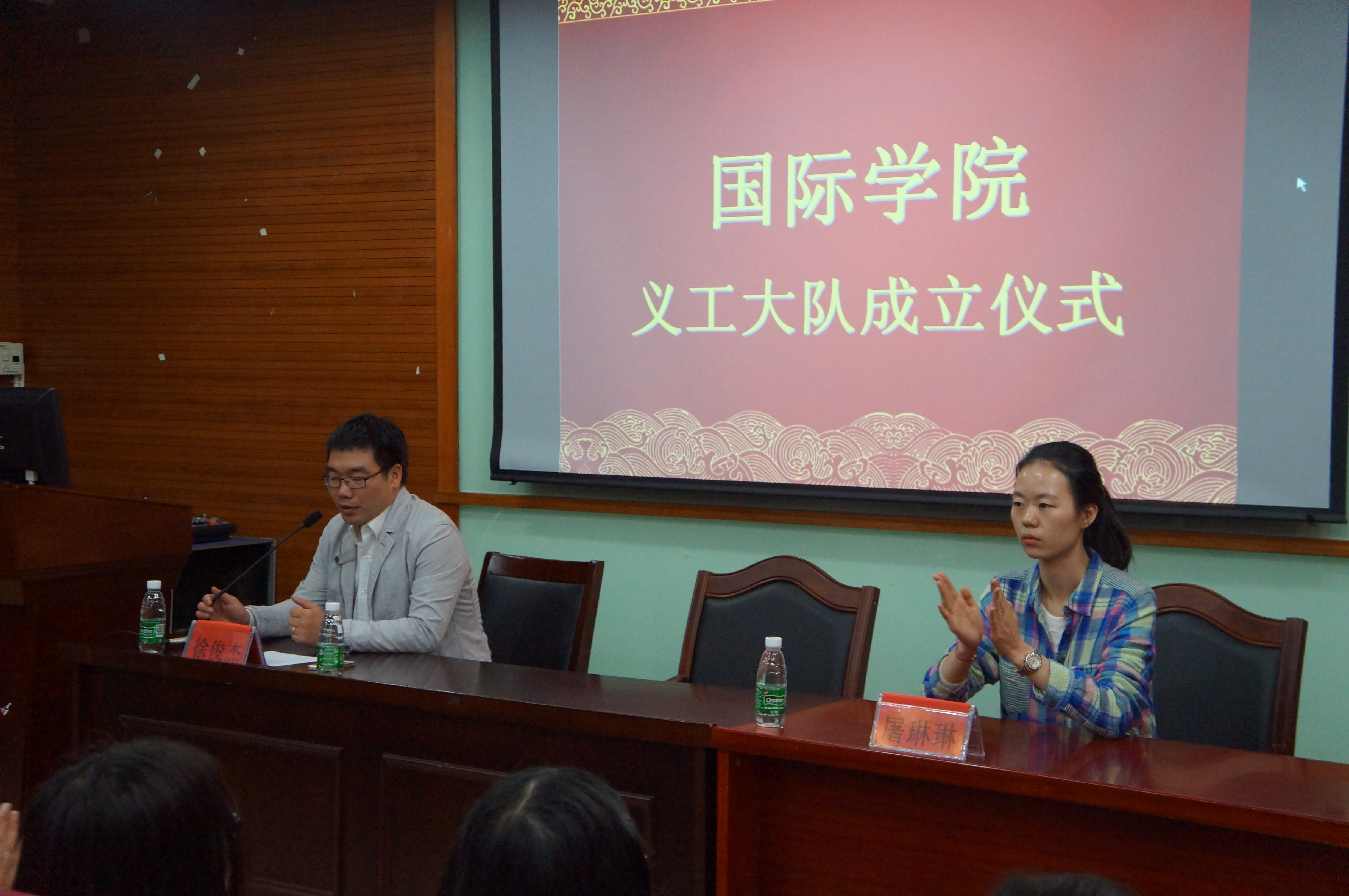 会议第一项议程,主持人介绍了参加此次成立仪式的领导人,讲解了国际学院义工大队的定义。参加此次成立仪式的领导人有:国际学院学工办主任徐俊杰老师,国际学院团委屠玲玲老师,国际学院学生会主席陈梦梦同学以及国际学院学生会副主席雷日江同学。