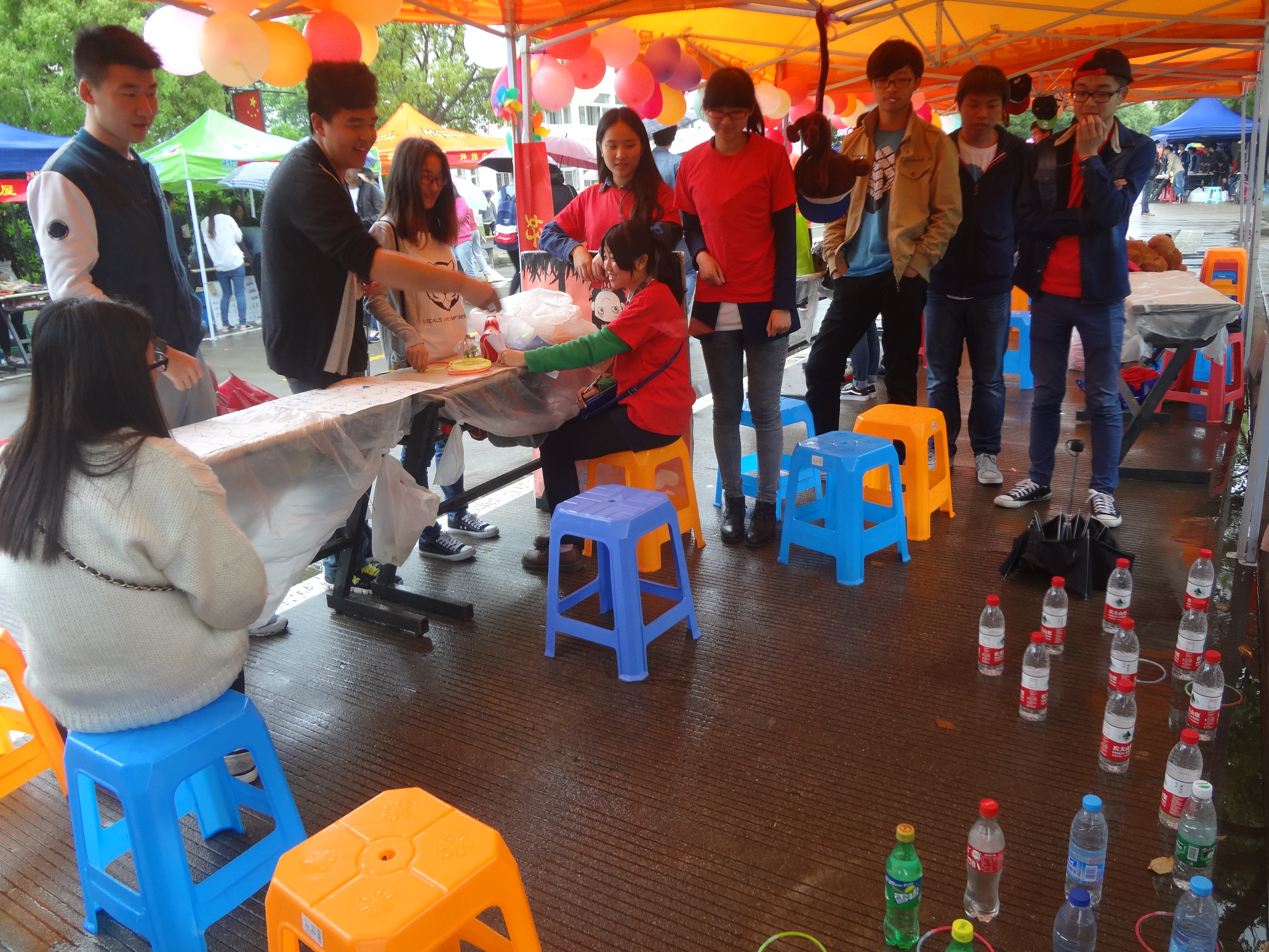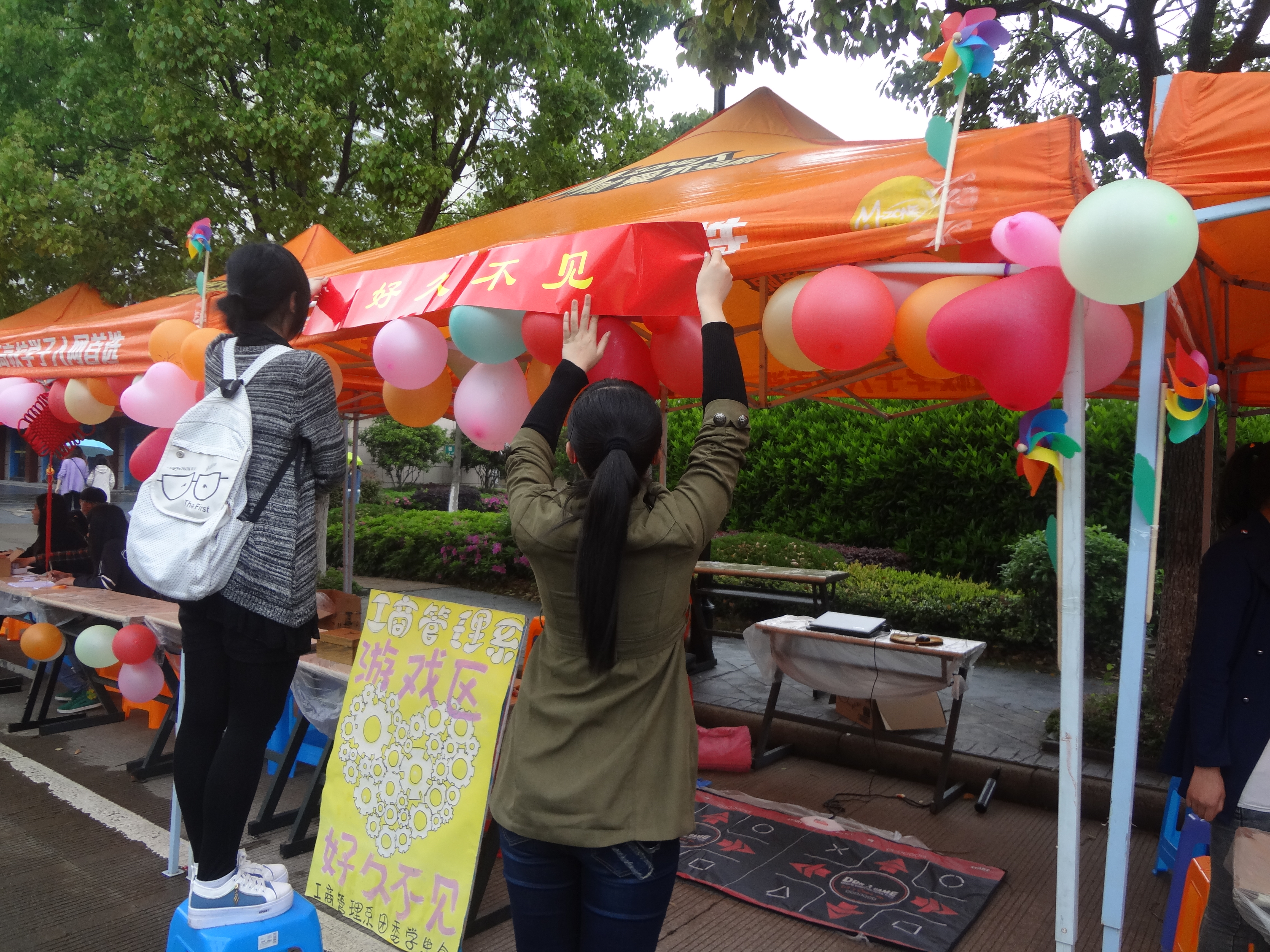 尽管天下着雨,但这并没有阻挡干事们对校庆的热情。早上五点半,工商管理系团委学生会的干事们就开始布置场地,专业区、美食区、游戏区都有序的进行着准备工作:搭棚、吹气球、装饰以及营业准备等等。游戏区准备游戏道具、设备;美食区忙着制作各种水果拼盘、柠檬茶和关东煮等。到了九点,各区正式开始营业。其中工商管理系美食区的“走过路过不要错过,水果沙拉5元一份”、“冰淇淋4元一份,快来买啊”、“好吃的关东煮,快来尝一尝”叫卖声持续不断,吸引了许多同学前来购买。而游戏区也不甘落后,一个个圈从同学们手中飞出,跃动跳舞毯边上围满了人,你画我猜处传来阵阵笑声。专业区的速录、点钞等活动也吸引了许多同学的眼光驻足参加。