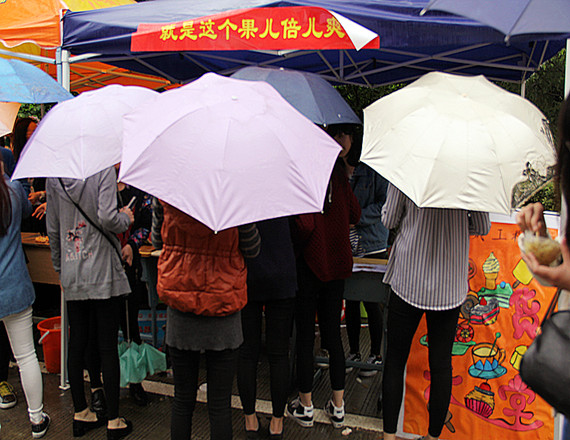 图为:建筑工程系的美食区上午8点左右,文化街两边的道路上已经整齐的排列着两列桌子,由于下雨的缘故,帐篷也已经搭好,一直往教学楼方向延伸。来到建筑工程系的美食负责区,光从美食的名字上看就够诱人,“就是这个果儿倍儿爽”丶“川味凉拌菜”丶“夏日良品”。不多会儿,随着创意歌舞大赛的结束,建筑工程系的美食负责区的人便越来越多。只要顺着人流,不知不觉就来到建筑工程系美食区。作为吃货的天堂,这的人气绝对是最高的。美食区的每个摊位上都围满了人,人头攒动,热闹非凡。尤其是自制水果拼盘摊位最是十分畅销,摊位外同学们一个个手里紧握着代币券探头探脑。尽管人很多,而且下着雨,但同学们的热情丝毫不减,时不时从人群中传出讨价还价的声音。从远处看,川流不息的人群中,人人手上拿满了吃的,吃着嘴里的,看着手里的,无不沉浸在美食的享受中,欢快的气氛弥漫了整个校园。