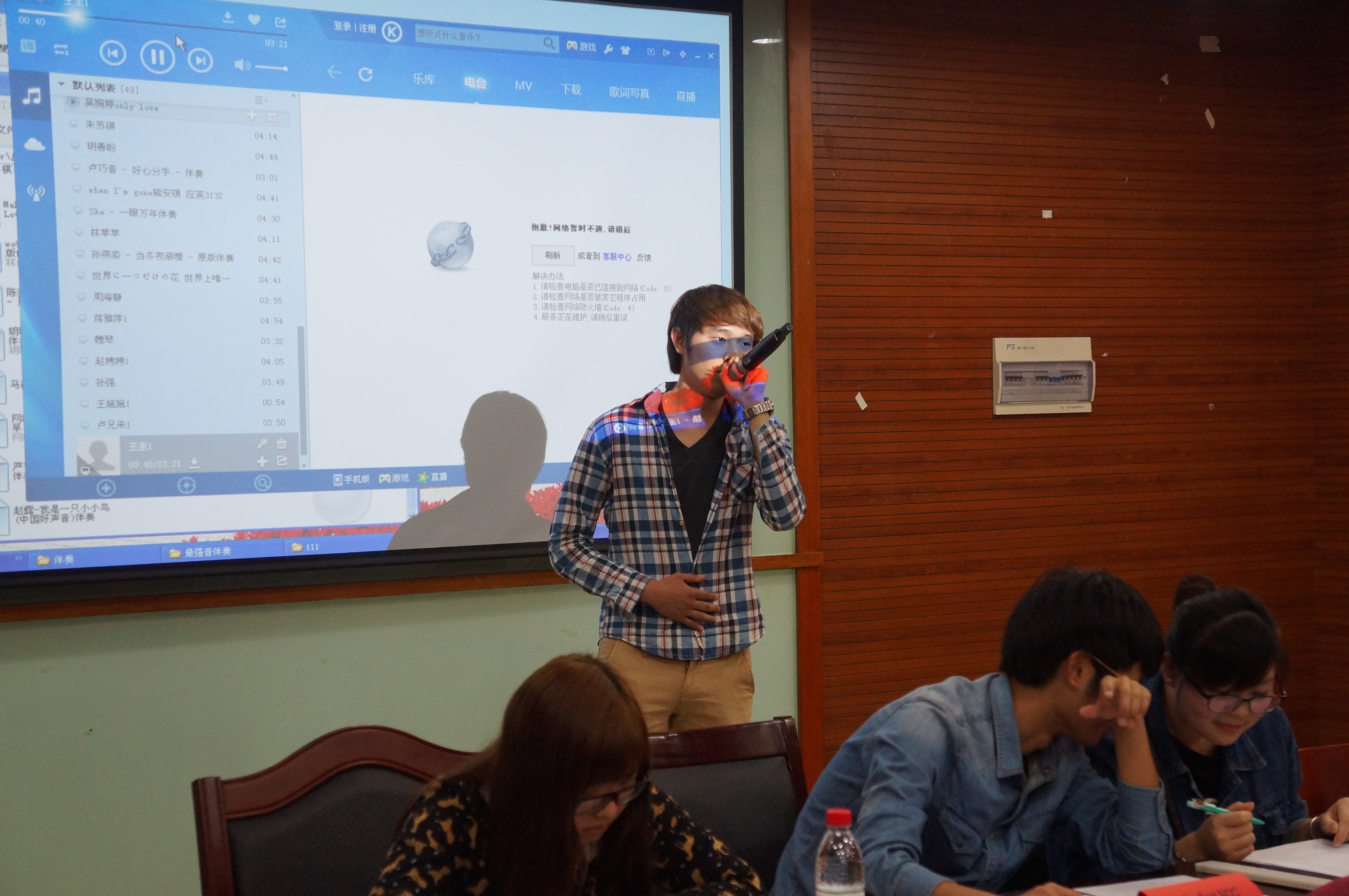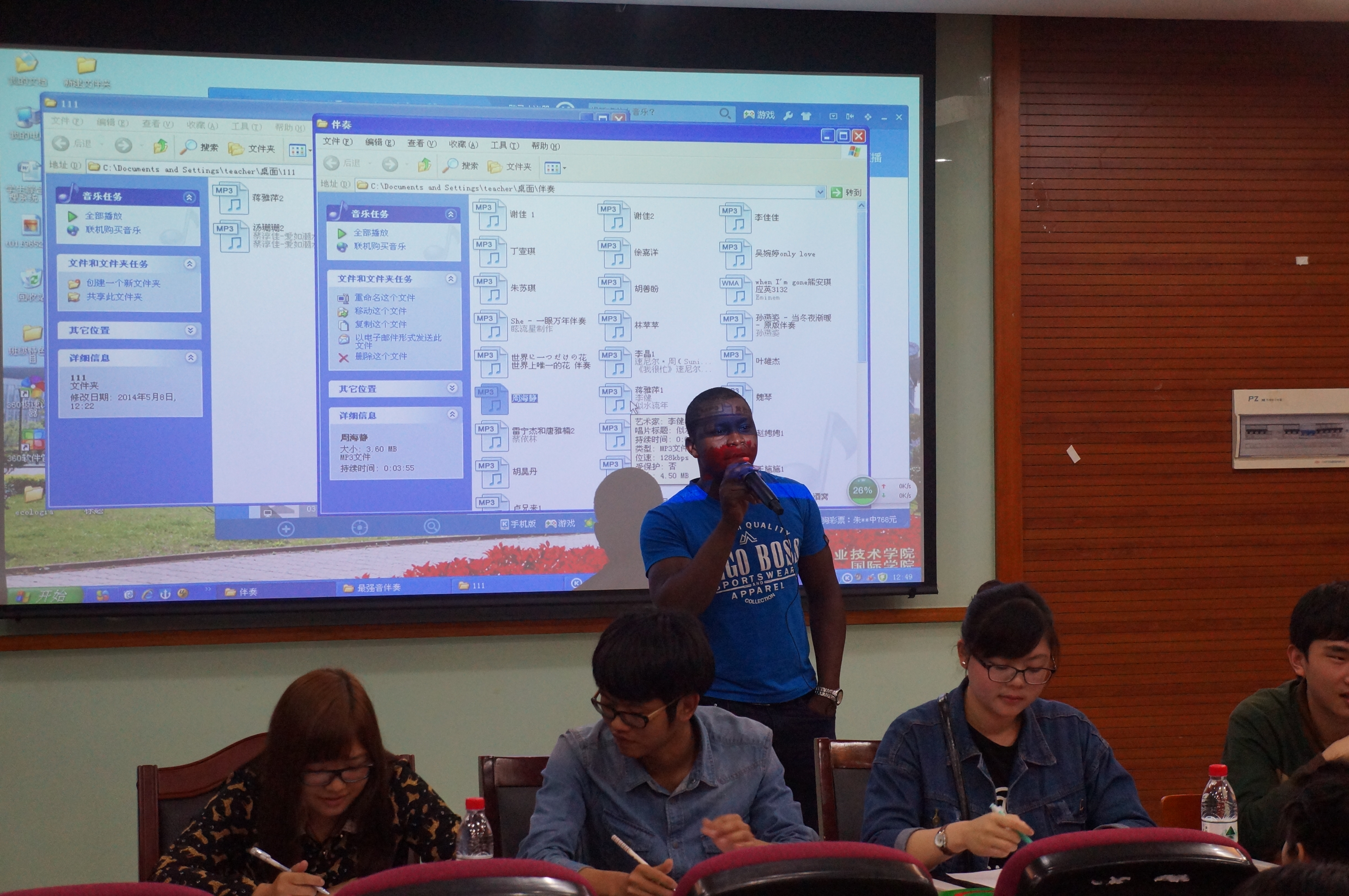 比赛伊始,第一位参赛选手带来的英文歌曲就使评委和观众深深触动,大家都更期待接下来的选手的表现。第一组演唱结束,总共有2人晋级下一轮,这让其余的选手更为激动、紧张。rap、抒情、劲爆、等各种不同类型的歌曲在教室里相汇,使每位观众都感受到音乐的感染力。此次比赛中来自国际学院的4位留学生带来的歌曲,结合了两国特色,更是将比赛的氛围推到最高潮。