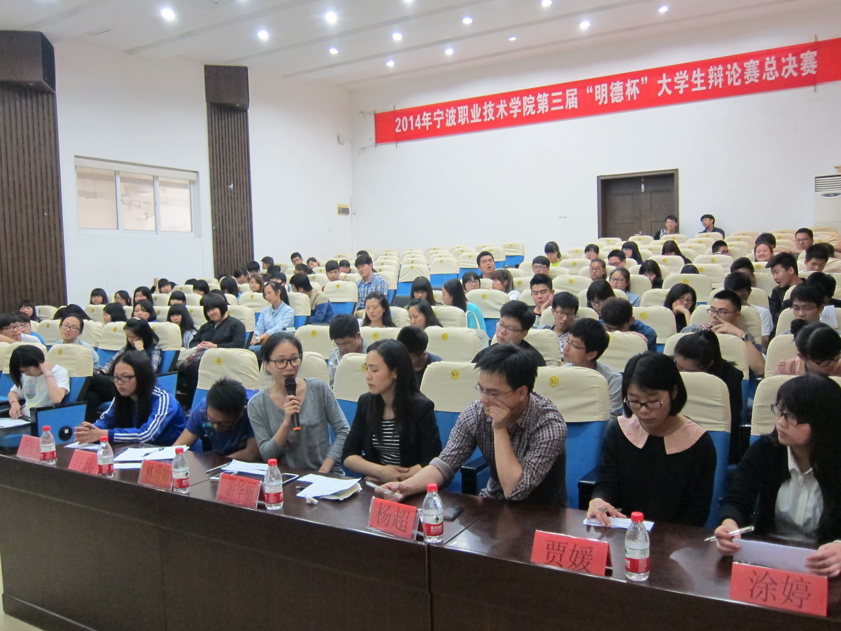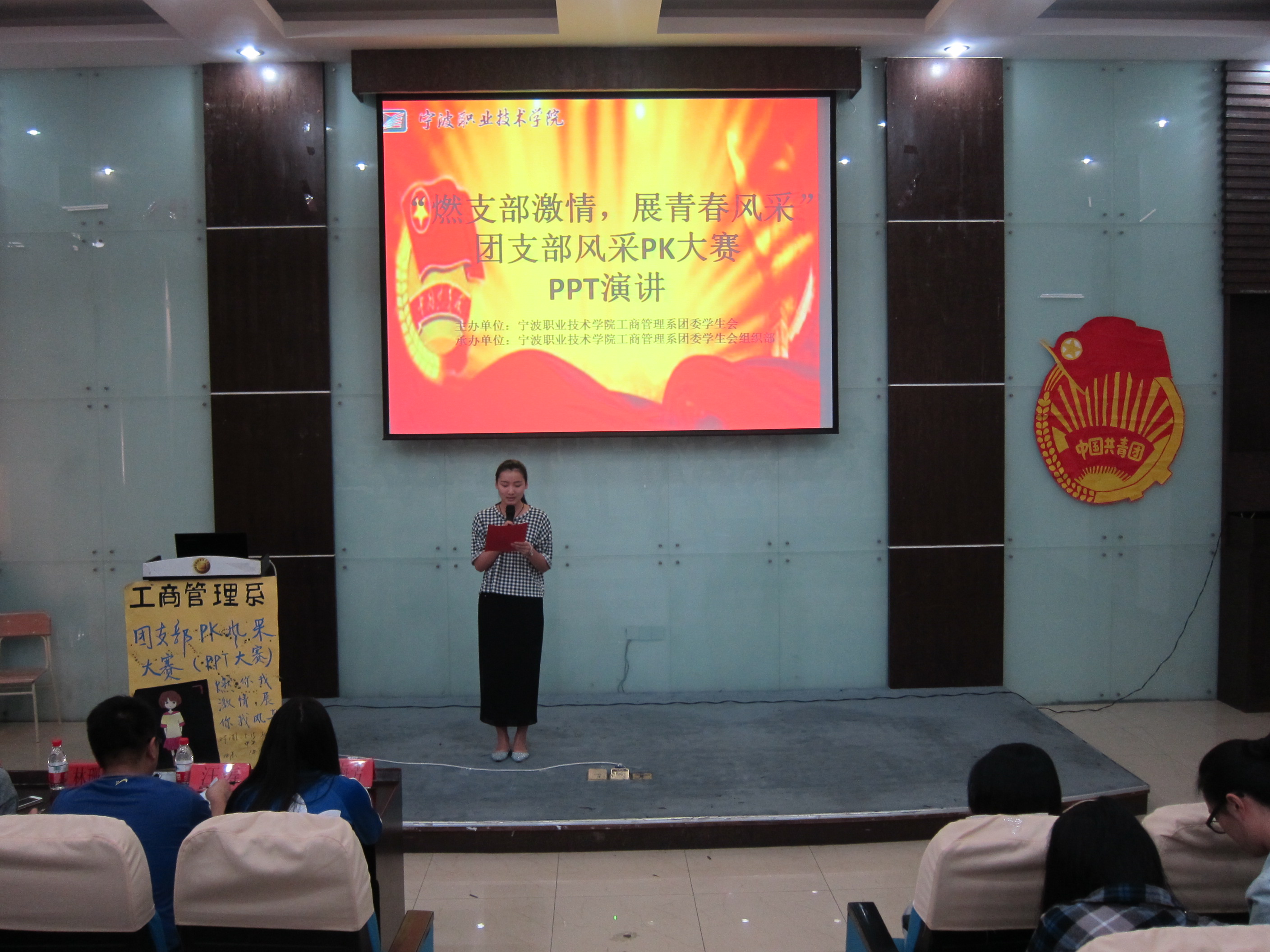 5月15日中午12点,宁波职业技术学院工商管理系在明德楼105会议室举行了以“燃你我激情,展你我风采”为主题的第五届团支部风采PK大赛之PPT演讲。工商管理系分团委书记游华丽,团委老师杨超、林珊帅,分团委副书记贾媛,学生会主席汪涛,组织部部长涂婷,组织部副部长阮海芳作为评委出席本次大赛。