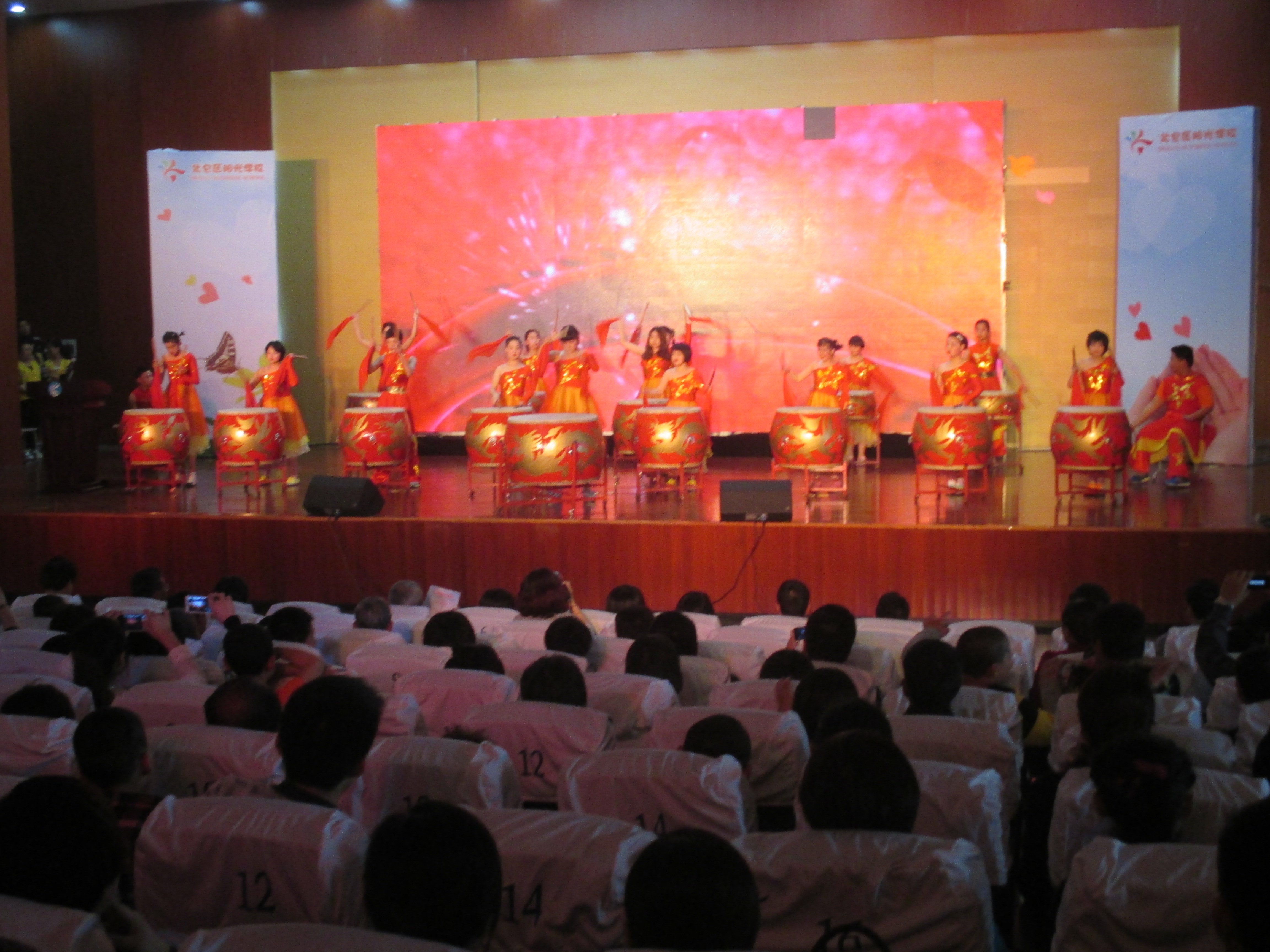 在活动中,志愿者们主要负责鼓掌,希望用一次次真诚的鼓掌让孩子们从中感受到爱,得到温暖。首先从开场的宣传片中,志愿者们看到了曾经与这些孩子们的回忆,暖暖的又扣人心弦,有种感动涌上心头。紧接着一串串节目精彩不断,如将军令,卖火柴的小姑娘,诗朗诵等。他们卖力的表演,真诚的表达,触动着在场的社会各界人士,同时也震撼着志愿者们的心灵,从主持人口中他们了解到台上短短几分钟的表演,这些孩子却用了整整一个学期来练习,来挑战自我。话音刚落观众席上传来一阵阵掌声,台上的孩子们笑了,笑的很灿烂。