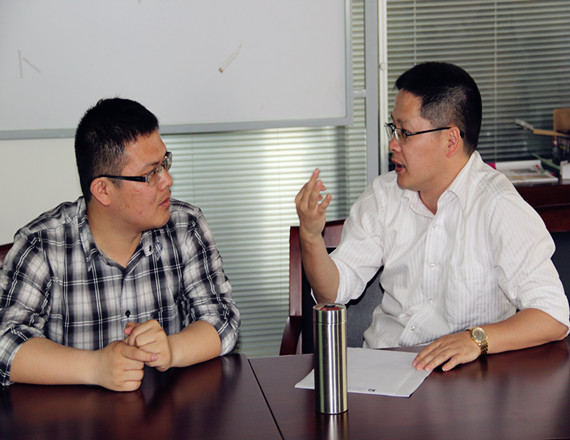 图为:会后,党总支书记丁立人老师同每位党员交流