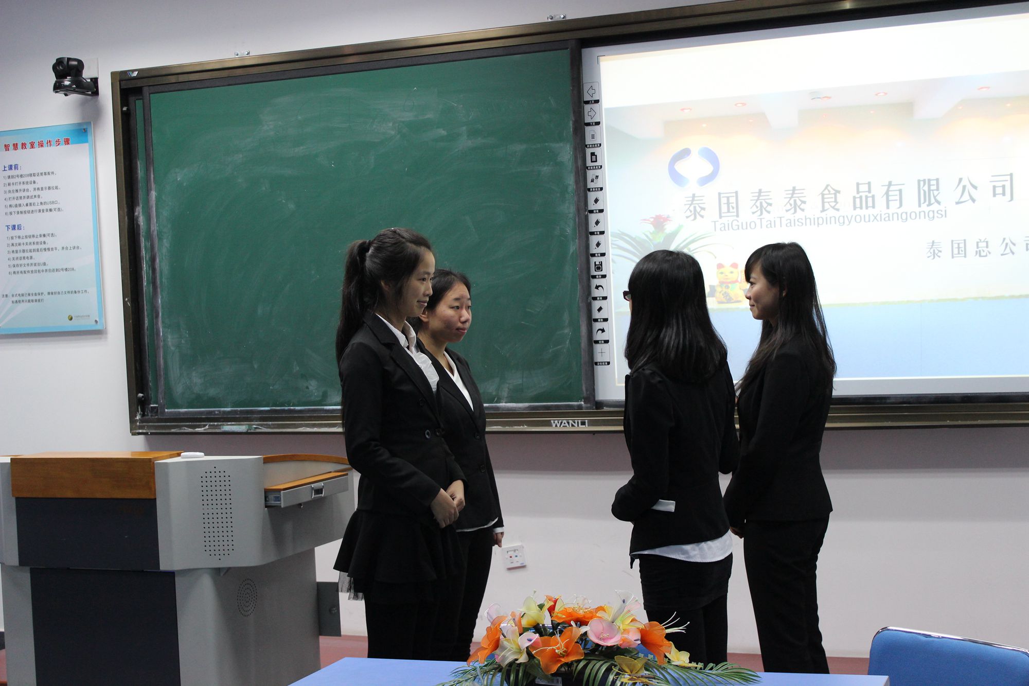 礼仪展示在3点10分正式开始,第一组演示小组是以两个贸易公司相互签订贸易协议为背景下的各种社交礼仪展示,第一小组从进场开始就以完善的人员配置得到其他展示组的好评,从签约司仪到总经理,总经理助理和秘书都十分完善。在演示过程中的从握手抖动次数、西装站扣坐放、入座从左入座等小科目上都没有出现错误。在签约大科目上签约项目上第一小组扮演秘书的同学也十分专业,签约本和笔的递放也恰到好处。