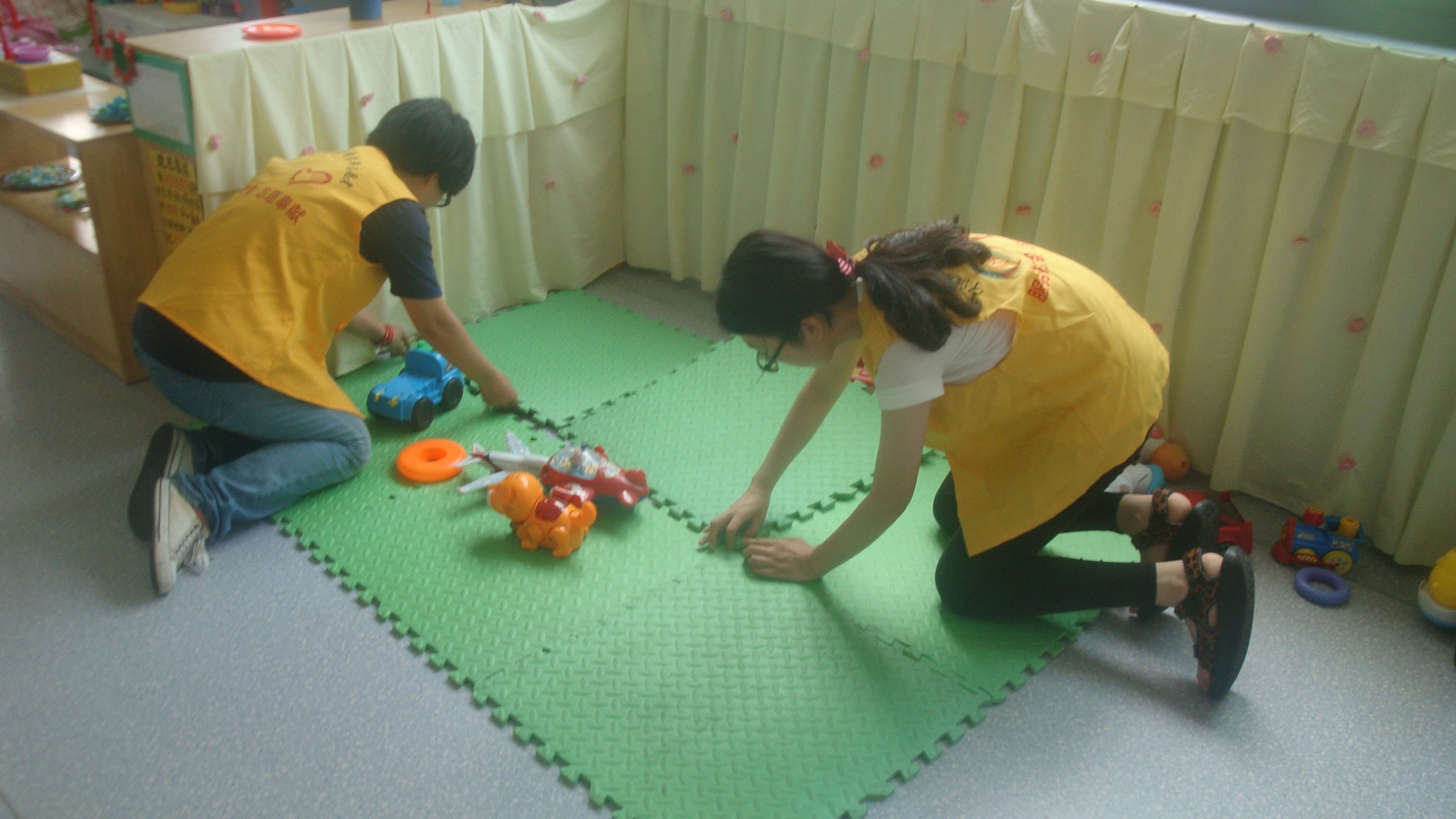 演出正式开始前,志愿者们分发适合小朋友的手拍,受到了热烈的欢迎。演出开始后,志愿者们坐在门外面询问着老师有没有什么其他需要帮助的。一堆架子鼓适时出现在大家面前,是原来刚才表演的小朋友的所表演过的乐器。在志愿者部部长带领下,大家一人抱起一小部分零件,轻轻的放在车上。演出结束后,小朋友们立刻围着我系的志愿者们,在临别前表现出不舍的样子。