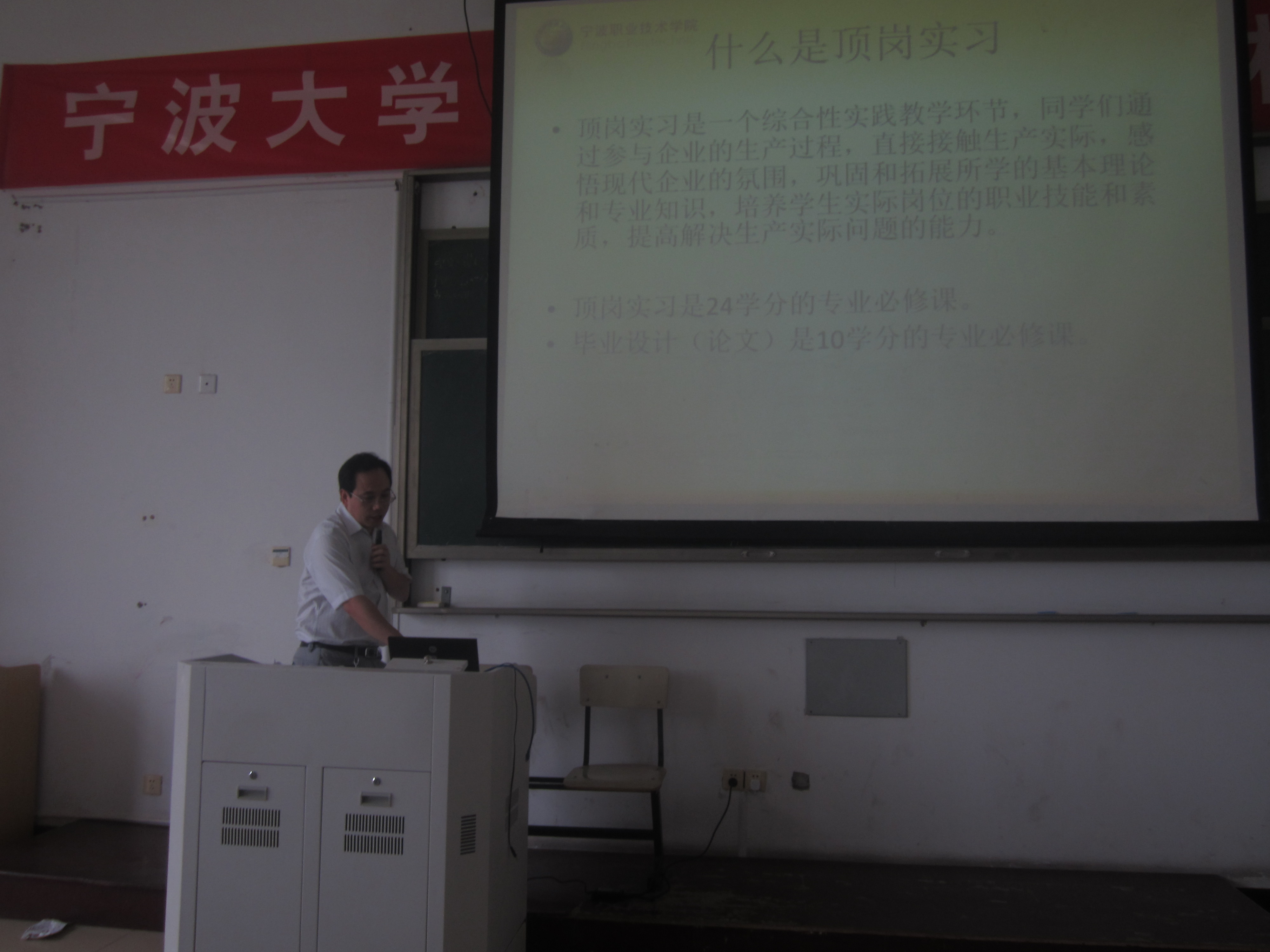 朱主任通过幻灯片的放映,详细讲述了未来一年的计划安排,强调了安全事宜。从实习周记,实习报告,网站上的个人信息、实习单位信息的填写,毕业论文的开题报告、正文,到顶岗实习联系函和考核表,签订就业协议书,朱建华老师都做了整理,还告知了专升本的相关事宜。由于关系到学生的切身实际问题,学生们兴趣很高。